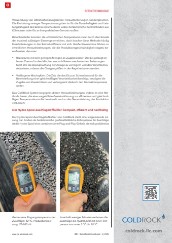 BETONTECHNOLOGIEwww.cpi-worldwide.com BWI %u2013 BetonWerk International %u2013 5 | 2025Verwendung von Ultrahochleistungsbeton Herausforderungen sondergleichen. Die Einhaltung strenger Temperaturvorgaben ist f%u00fcr die Dauerhaftigkeit und Leistungsf%u00e4higkeit des Betons entscheidend, wobei herk%u00f6mmliche K%u00fchlmethoden wie K%u00fchlwasser oder Eis an ihre praktischen Grenzen sto%u00dfen.Betonhersteller konnten die erforderlichen Temperaturen zwar durch den Einsatz der maximal zul%u00e4ssigen Eismenge erreichen, doch brachte diese Methode h%u00e4ufig Einschr%u00e4nkungen in der Betriebseffizienz mit sich. Gro%u00dfe Eisvolumina f%u00fchrten zu erheblichen Herausforderungen, die die Produktionsgeschwindigkeit negativ beeinflussten, darunter:%u2022 Rezepturen mit sehr geringen Mengen an Zugabewasser: Das Eis gelangt im festen Zustand in den Mischer, was zu h%u00f6heren mechanischen Belastungen f%u00fchrt. Um die Beanspruchung der Anlage zu verringern und den Verschlei%u00df zu reduzieren, m%u00fcssen die Chargengr%u00f6%u00dfen in der Regel reduziert werden.%u2022 Verl%u00e4ngerte Mischzyklen: Die Zeit, die das Eis zum Schmelzen und f%u00fcr die Bereitstellung einer gleichm%u00e4%u00dfigen Verarbeitbarkeit ben%u00f6tigt, verz%u00f6gert die Zugabe von Zusatzmitteln und verlangsamt dadurch den Produktionsprozess weiter.Das ColdRock System begegnet diesen Herausforderungen, indem es eine Methode bietet, die eine vorgek%u00fchlte Gesteinsk%u00f6rnung zur effizienten und gleichm%u00e4%u00dfigen Temperaturkontrolle bereitstellt und so die Gesamtleistung der Produktion verbessert.Der Hydro-Spiral-Zuschlagstoffk%u00fchler: kompakt, effizient und nachhaltigDer Hydro-Spiral-Zuschlagstoffk%u00fchler von ColdRock stellt eine wegweisende L%u00f6sung dar. Anders als herk%u00f6mmliche gro%u00dfma%u00dfst%u00e4bliche K%u00fchlsysteme f%u00fcr Zuschl%u00e4ge ist die Hydro-Spiral eine containerisierte Plug-and-Play-Einheit, die sich problemlos Gemessene Eingangstemperatur der Zuschl%u00e4ge: 42 %u00b0C, Produktionsleistung: 70-100 t/hInnerhalb weniger Minuten verlassen die Zuschl%u00e4ge die HydroSpiral mit einer Temperatur von unter 5 %u00b0C bis 10 %u00b0C.coldrock-llc.com