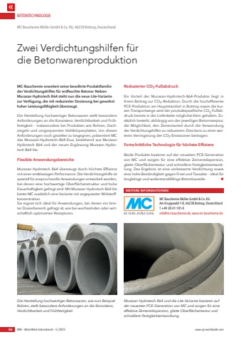 BETONTECHNOLOGIE66 BWI %u2013 BetonWerk International %u2013 5 | 2025 www.cpi-worldwide.comMC-Bauchemie erweitert seine bew%u00e4hrte Produktfamilie der Verdichtungshilfen f%u00fcr erdfeuchte Betone: Neben Murasan Hydrotech 864 steht nun die neue Lite-Variante zur Verf%u00fcgung, die mit reduzierter Dosierung bei gewohnt hoher Leistungsf%u00e4higkeit %u00fcberzeugt.Die Herstellung hochwertiger Betonwaren stellt besondere Anforderungen an die Konsistenz, Verdichtbarkeit und Fr%u00fchfestigkeit %u2013 insbesondere bei Produkten wie Rohren, Dachziegeln und vorgespannten Hohlk%u00f6rperplatten. Um diesen Anforderungen noch gezielter zu begegnen, pr%u00e4sentiert MC das Murasan-Hydrotech-864-Duo, bestehend aus Murasan Hydrotech 864 und der neuen Erg%u00e4nzung Murasan Hydrotech 864 lite.Flexible AnwendungsbereicheMurasan Hydrotech 864 %u00fcberzeugt durch h%u00f6chste Effizienz mit einer erstklassigen Performance. Die Verdichtungshilfe ist speziell f%u00fcr anspruchsvolle Anwendungen entwickelt worden, bei denen eine hochwertige Oberfl%u00e4chenstruktur und hohe Dauerhaftigkeit gefragt sind. Mit Murasan Hydrotech 864 lite bietet MC zus%u00e4tzlich eine Variante mit angepasster Wirkstoffkonzentration. Sie eignet sich ideal f%u00fcr Anwendungen, bei denen ein breiter Dosierbereich gefragt ist, wie bei wechselnden oder wirtschaftlich optimierten Rezepturen.Reduzierter CO2-Fu%u00dfabdruckEin Vorteil der Murasan-Hydrotech-864-Produkte liegt in ihrem Beitrag zur CO2-Reduktion. Durch die hocheffiziente PCE-Produktion am Hauptstandort in Bottrop sowie die kurzen Transportwege wird der produktspezifische CO2-Fu%u00dfabdruck bereits in der Lieferkette m%u00f6glichst klein gehalten. Zus%u00e4tzlich besteht, abh%u00e4ngig von der jeweiligen Betonrezeptur, die M%u00f6glichkeit, den Zementanteil durch die Verwendung der Verdichtungshilfen zu reduzieren. Dies kann zu einer weiteren Verringerung der CO2-Emissionen beitragen.Fortschrittliche Technologie f%u00fcr h%u00f6chste EffizienzBeide Produkte basieren auf der neuesten PCE-Generation von MC und sorgen f%u00fcr eine effektive Zementdispersion, glatte Oberfl%u00e4chentextur und schnellere Festigkeitsentwicklung. Das Ergebnis ist eine verbesserte Verdichtung sowie eine hohe Best%u00e4ndigkeit gegen Frost und Tausalze %u2013 ideal f%u00fcr langlebige und widerstandsf%u00e4hige Betonbauteile. nZwei Verdichtungshilfen f%u00fcr die BetonwarenproduktionMC Bauchemie M%u00fcller GmbH & Co. KG, 46238 Bottrop, DeutschlandWEITERE INFORMATIONENMC Bauchemie M%u00fcller GmbH & Co. KGAm Kruppwald 1-8, 46238 Bottrop, DeutschlandT +49 20 41 101-0info@mc-bauchemie.de, www.mc-bauchemie.deDie Herstellung hochwertiger Betonwaren, wie zum Beispiel Rohren, stellt besondere Anforderungen an die Konsistenz, Verdichtbarkeit und Fr%u00fchfestigkeit.Murasan Hydrotech 864 und die Lite-Variante basieren auf der neuesten PCE-Generation von MC und sorgen f%u00fcr eine effektive Zementdispersion, glatte Oberfl%u00e4chentextur und schnellere Festigkeitsentwicklung.