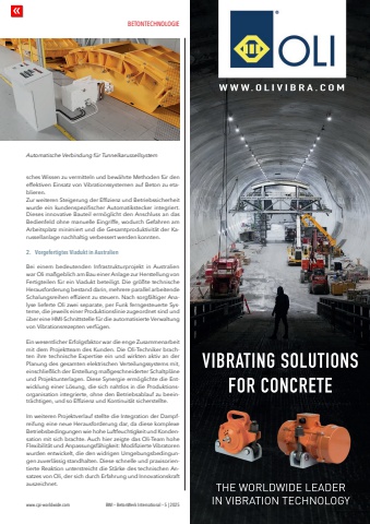 BETONTECHNOLOGIEwww.cpi-worldwide.com BWI %u2013 BetonWerk International %u2013 5 | 2025sches Wissen zu vermitteln und bew%u00e4hrte Methoden f%u00fcr den effektiven Einsatz von Vibrationssystemen auf Beton zu etablieren.Zur weiteren Steigerung der Effizienz und Betriebssicherheit wurde ein kundenspezifischer Automatikstecker integriert. Dieses innovative Bauteil erm%u00f6glicht den Anschluss an das Bedienfeld ohne manuelle Eingriffe, wodurch Gefahren am Arbeitsplatz minimiert und die Gesamtproduktivit%u00e4t der Karussellanlage nachhaltig verbessert werden konnten.2. %u0009 Vorgefertigtes Viadukt in AustralienBei einem bedeutenden Infrastrukturprojekt in Australien war Oli ma%u00dfgeblich am Bau einer Anlage zur Herstellung von Fertigteilen f%u00fcr ein Viadukt beteiligt. Die gr%u00f6%u00dfte technische Herausforderung bestand darin, mehrere parallel arbeitende Schalungsreihen effizient zu steuern. Nach sorgf%u00e4ltiger Analyse lieferte Oli zwei separate, per Funk ferngesteuerte Systeme, die jeweils einer Produktionslinie zugeordnet sind und %u00fcber eine HMI-Schnittstelle f%u00fcr die automatisierte Verwaltung von Vibrationsrezepten verf%u00fcgen.Ein wesentlicher Erfolgsfaktor war die enge Zusammenarbeit mit dem Projektteam des Kunden. Die Oli-Techniker brachten ihre technische Expertise ein und wirkten aktiv an der Planung des gesamten elektrischen Verteilungssystems mit, einschlie%u00dflich der Erstellung ma%u00dfgeschneiderter Schaltpl%u00e4ne und Projektunterlagen. Diese Synergie erm%u00f6glichte die Entwicklung einer L%u00f6sung, die sich nahtlos in die Produktionsorganisation integrierte, ohne den Betriebsablauf zu beeintr%u00e4chtigen, und so Effizienz und Kontinuit%u00e4t sicherstellte.Im weiteren Projektverlauf stellte die Integration der Dampfreifung eine neue Herausforderung dar, da diese komplexe Betriebsbedingungen wie hohe Luftfeuchtigkeit und Kondensation mit sich brachte. Auch hier zeigte das Oli-Team hohe Flexibilit%u00e4t und Anpassungsf%u00e4higkeit: Modifizierte Vibratoren wurden entwickelt, die den widrigen Umgebungsbedingungen zuverl%u00e4ssig standhalten. Diese schnelle und praxisorientierte Reaktion unterstreicht die St%u00e4rke des technischen Ansatzes von Oli, der sich durch Erfahrung und Innovationskraft auszeichnet.Automatische Verbindung f%u00fcr Tunnelkarussellsystem