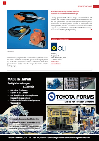 BETONTECHNOLOGIEwww.cpi-worldwide.com BWI %u2013 BetonWerk International %u2013 5 | 2025 71MADE IN JAPANFertigteilschalungen & Zubeh%u00f6r- 60 Jahre Erfahrung- Export in 27 L%u00e4nder- auf Knopfdruck schrumpfender innerer Schalungskern- Individuelle Sonderanfertigungen- Wasserdicht TOYOTA KOHKI CO., LTD. | Tel.: +81 42(366)6011 | info@toyotaforms.com | www.toyotaforms.comVertretung in Deutschland und %u00d6sterreich: ROBUSTA-GAUKEL GMBH&CO.KGBrunnenstr. 36 | 71263 Weil der Stadt Tel.: +49 (0)7033 5371 10 | Fax: +49 (0)7033 5371 31info@robusta-gaukel.com | www.robusta-gaukel.detremen Bedingungen sicher und zuverl%u00e4ssig arbeitet. Dar%u00fcber hinaus bietet Oli komplette, gebrauchsfertige Systeme an, die Kunden eine kontinuierliche und sichere Produktion gew%u00e4hrleisten %u2013 selbst unter den anspruchsvollsten Einsatzbedingungen.Kundenorientierung und technischer Support als Fundament des ErfolgsOli legt gro%u00dfen Wert auf eine enge Zusammenarbeit mit Kunden und Partnern. Das Unternehmen steht jederzeit bereit, um gemeinsam spezifische Projektanforderungen zu analysieren, Vibrationssysteme optimal zu integrieren und einen gezielten, soliden sowie kontinuierlichen technischen Support zu gew%u00e4hrleisten. Diese partnerschaftliche Herangehensweise sichert langfristigen Erfolg. nWEITERE INFORMATIONENOLI Italy S.p.A.Via Sparato, 1441036 Medolla (MO), ItalienT +39 0535 410 611info@olivibra.itwww.olivibra.comVibratoren