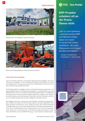 BETONTECHNOLOGIEwww.cpi-worldwide.com BWI %u2013 BetonWerk International %u2013 5 | 2025Trust in Concrete InnovationTrust in Concrete Innovation, so lautet der Slogan der Firma Wiggert. Und es ist mehr als nur ein Slogan %u2013 es ist ein Versprechen, gibt das Unternehmen zu verstehen. Wiggert sieht sich als gesund wachsendes mittelst%u00e4ndisches Unternehmen mit klarer Ausrichtung: Qualit%u00e4t statt Gr%u00f6%u00dfe. Das Produktportfolio von Wiggert reicht von bew%u00e4hrten Planeten-Gegenstrom- und Doppelwellenmischern %u00fcber Betontransportsysteme mit K%u00fcbelbahnen und oder Betonverteilern bis hin zu modernen Automatisierungsl%u00f6sungen. Im Mittelpunkt steht dabei immer die kontinuierliche Weiterentwicklung %u2013 basierend auf direktem Kundenfeedback und jahrzehntelanger Praxiserfahrung. Die Philosophie des Hauses ist so bodenst%u00e4ndig wie konsequent: M%u00f6glichst viel selbst machen.Was Wiggert besonders auszeichnet, ist die F%u00e4higkeit, individuelle Anlagenl%u00f6sungen zu liefern, die genau auf die Anforderungen der Kunden abgestimmt sind. Dabei greift das Unternehmen auf ein solides und %u00fcber Jahre weiterentwickeltes Produktportfolio zur%u00fcck. Ein echtes Erfolgsmodell ist der Planeten-Gegenstrommischer, der seit 1990 produziert wird und mittlerweile in der 10. Version angeboten wird. Letztes Jahr wurde bereits der 1.700. Planeten-Gegenstrommischer ausgeliefert. Der Mischer vom Typ HPGM 1875 ging an einen Kunden in Nordamerika.Hauptsitz der Firma Wiggert in Karlsruhe-DurlachBlick in die Fertigungshalle am Standort Karlsruhe-Durlach