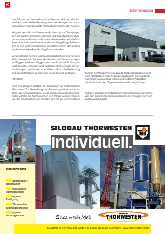BETONTECHNOLOGIEwww.cpi-worldwide.com BWI %u2013 BetonWerk International %u2013 5 | 2025 75der Anlagen zur Herstellung von Betonprodukten aller Art. Im Fokus steht dabei die Integration der Anlagen und Komponenten in nachgelagerte Produktionssysteme der Kunden.Wiggert versteht sich heute mehr denn je als Teamplayer, der sich partnerschaftlich einbringt und Verantwortung %u00fcbernimmt, um so Mehrwerte f%u00fcr seine Auftraggeber zu schaffen. Sowohl technisches Know-how als auch langj%u00e4hrige Erfahrungen in den unterschiedlichen Einsatzbereichen des Betons sind weitere Aspekte, die eingebracht werden.Verl%u00e4sslichkeit, Termin- und Qualit%u00e4tssicherheit sind nur eine kleine Auswahl an Punkten, die Kunden und Partner weltweit an Wiggert sch%u00e4tzen. Wiggert setzt auf Fortschrittlichkeit, um noch flexibler, schneller und qualitativ hochwertiger die Anforderungen der Kunden zu erf%u00fcllen und um die Bedeutung des Baustoffs Beton gemeinsam in die Zukunft zu tragen.FabrikationDie Firma Wiggert setzt bei der Produktion auf hochmoderne Maschinen. Zur Herstellung der Anlagen geh%u00f6ren automatische Laserschneidanlagen, Biegemaschinen und Schwei%u00dfroboter, welche die Komponenten der Anlage pr%u00e4zise fertigen, um den Anspr%u00fcchen der Kunden gerecht zu werden. Diese Anlagen werden weitestgehend mit Solarenergie betrieben, was den ganzen Herstellungsprozess der Anlagen sehr umweltbewusst macht.K%u00fcrzlich hat Wiggert in eine zweite Produktionshalle in Karlsruhe-Palmbach investiert, da die Kapazit%u00e4ten am Hauptsitz nicht mehr ausreichend waren und weiteres Wachstum durch die %u00f6rtlichen Gegebenheiten nicht m%u00f6glich war.Baustoffsilos eigeneMontagekrane ThorwestenMontagepersonal eigeneFertigung individuelleAbmessungen geschraubt /geschwei%u00dft SILOBAU THORWESTEN GmbH, D-59269 Beckum (Germany), www.thorwesten.comIndividuell.SILOBAU THORWESTEN
