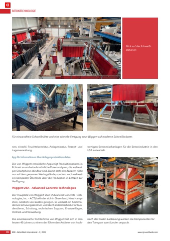 BETONTECHNOLOGIE78 BWI %u2013 BetonWerk International %u2013 5 | 2025 www.cpi-worldwide.comnen, einschl. Feuchtekorrektur, Anlagenstatus, Rezept- und Lagerverwaltung. App f%u00fcr Informationen %u00fcber AnlagenproduktionsdatenDie von Wiggert entwickelte App zeigt Produktionsdaten in Echtzeit an und erlaubt n%u00fctzliche Datenanalysen, die weltweit per Smartphone abrufbar sind. Damit steht den Nutzern nicht nur auf dem gesamten Werksgel%u00e4nde, sondern auch weltweit ein kompakter %u00dcberblick %u00fcber die Produktion in Echtzeit zur Verf%u00fcgung.Wiggert USA %u2013 Advanced Concrete TechnologiesDer Hauptsitz von Wiggert USA (Advanced Concrete Technologies, Inc. %u2013 ACT) befindet sich in Greenland, New Hampshire, n%u00f6rdlich von Boston gelegen. Er umfasst ein hochmodernes Schulungszentrum und dient als Drehscheibe f%u00fcr Kundendienst, Schulung, technischen Support, Ersatzteillager, Vertrieb und Verwaltung.Die amerikanische Tochterfirma von Wiggert hat sich in den letzten 40 Jahren zu einem der f%u00fchrenden Anbieter von hochwertigen Betonmischanlagen f%u00fcr die Betonindustrie in den USA entwickelt. F%u00fcr einwandfreie Schwei%u00dfn%u00e4hte und eine schnelle Fertigung setzt Wiggert auf moderne Schwei%u00dfroboter.Nach der finalen Lackierung werden die Komponenten f%u00fcr den Transport zum Kunden verpackt. Blick auf die Schwei%u00dfstationen
