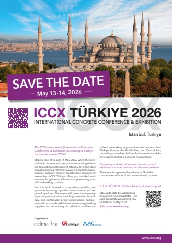 INTERNATIONAL CONCRETE CONFERENCE & EXHIBITIONICCX T%u00dcRKIYE 2026 _ May 13 -14, 2026SAVE THE DATE _Istanbul, T%u00fcrkiyewww.iccx.org OrganisationTrade Journal for the Autoclaved Aerated Concrete IndustryThe ICCX event series (International ConcreteConference & Exhibition) is coming to T%u00fcrkiyefor the fi rst time in 2026! Make a note of 13 and 14 May 2026, when the international concrete and precast industry will gather in the fascinating metropolis of Istanbul for a top-class industry meeting. Whether you are a concrete manufacturer, supplier, planner, construction company or researcher %u2013 ICCX T%u00fcrkiye offers you the ideal environment for gathering information, presenting yourself and making contacts.You can look forward to a two-day specialist programme featuring top-class international and regional speakers. The event will cover cutting-edge topics in prefabrication, building materials technology, and earthquake-proof construction, complemented by a trade exhibition showcasing leading suppliers in the industry. In addition, it offers excellent networking opportunities with experts from T%u00fcrkiye, Europe, the Middle East, and Central Asia, providing a valuable platform for innovation and the development of new business relationships.Constantly updated information for visitors andexhibitors can now be found on the event website.The event is organised by ad-media GmbH incooperation with local and international partners.ICCX T%u00dcRKIYE 2026 %u2013 Istanbul awaits you! Stay up to date by subscribing to our free ICCX newsletter %u2013 we look forward to welcoming you to Istanbul in May 2026.Join us on www.iccx.org