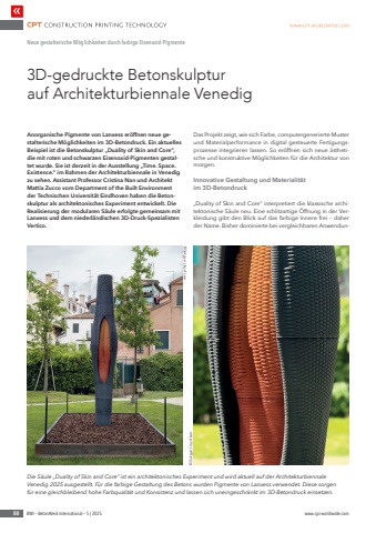 88 BWI %u2013 BetonWerk International %u2013 5 | 2025 www.cpi-worldwide.comAnorganische Pigmente von Lanxess er%u00f6ffnen neue gestalterische M%u00f6glichkeiten im 3D-Betondruck. Ein aktuelles Beispiel ist die Betonskulptur %u201eDuality of Skin and Core%u201c, die mit roten und schwarzen Eisenoxid-Pigmenten gestaltet wurde. Sie ist derzeit in der Ausstellung %u201eTime. Space. Existence.%u201c im Rahmen der Architekturbiennale in Venedig zu sehen. Assistant Professor Cristina Nan und Architekt Mattia Zucco vom Department of the Built Environment der Technischen Universit%u00e4t Eindhoven haben die Betonskulptur als architektonisches Experiment entwickelt. Die Realisierung der modularen S%u00e4ule erfolgte gemeinsam mit Lanxess und dem niederl%u00e4ndischen 3D-Druck-Spezialisten Vertico. Das Projekt zeigt, wie sich Farbe, computergenerierte Muster und Materialperformance in digital gesteuerte Fertigungsprozesse integrieren lassen. So er%u00f6ffnen sich neue %u00e4sthetische und konstruktive M%u00f6glichkeiten f%u00fcr die Architektur von morgen. Innovative Gestaltung und Materialit%u00e4t im 3D-Betondruck%u201eDuality of Skin and Core%u201c interpretiert die klassische architektonische S%u00e4ule neu. Eine schlitzartige %u00d6ffnung in der Verkleidung gibt den Blick auf das farbige Innere frei %u2013 daher der Name. Bisher dominierte bei vergleichbaren Anwendun3D-gedruckte Betonskulptur auf Architekturbiennale VenedigNeue gestalterische M%u00f6glichkeiten durch farbige Eisenoxid-Pigmente Die S%u00e4ule %u201eDuality of Skin and Core%u201c ist ein architektonisches Experiment und wird aktuell auf der Architekturbiennale Venedig 2025 ausgestellt. F%u00fcr die farbige Gestaltung des Betons wurden Pigmente von Lanxess verwendet. Diese sorgen f%u00fcr eine gleichbleibend hohe Farbqualit%u00e4t und Konsistenz und lassen sich uneingeschr%u00e4nkt im 3D-Betondruck einsetzen. %u00a9Sukgyo Lloyd Lee %u00a9Sukgyo Lloyd Lee