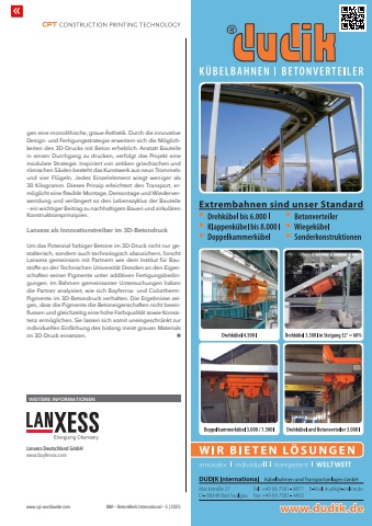www.cpi-worldwide.com BWI %u2013 BetonWerk International %u2013 5 | 2025gen eine monolithische, graue %u00c4sthetik. Durch die innovative Design- und Fertigungsstrategie erweitern sich die M%u00f6glichkeiten des 3D-Drucks mit Beton erheblich. Anstatt Bauteile in einem Durchgang zu drucken, verfolgt das Projekt eine modulare Strategie. Inspiriert von antiken griechischen und r%u00f6mischen S%u00e4ulen besteht das Kunstwerk aus neun Trommeln und vier Fl%u00fcgeln. Jedes Einzelelement wiegt weniger als 30 Kilogramm. Dieses Prinzip erleichtert den Transport, erm%u00f6glicht eine flexible Montage, Demontage und Wiederverwendung und verl%u00e4ngert so den Lebenszyklus der Bauteile %u2013 ein wichtiger Beitrag zu nachhaltigem Bauen und zirkul%u00e4ren Konstruktionsprinzipien.Lanxess als Innovationstreiber im 3D-BetondruckUm das Potenzial farbiger Betone im 3D-Druck nicht nur gestalterisch, sondern auch technologisch abzusichern, forscht Lanxess gemeinsam mit Partnern wie dem Institut f%u00fcr Baustoffe an der Technischen Universit%u00e4t Dresden an den Eigenschaften seiner Pigmente unter additiven Fertigungsbedingungen. Im Rahmen gemeinsamer Untersuchungen haben die Partner analysiert, wie sich Bayferrox- und ColorthermPigmente im 3D-Betondruck verhalten. Die Ergebnisse zeigen, dass die Pigmente die Betoneigenschaften nicht beeinflussen und gleichzeitig eine hohe Farbqualit%u00e4t sowie Konsistenz erm%u00f6glichen. Sie lassen sich somit uneingeschr%u00e4nkt zur individuellen Einf%u00e4rbung des bislang meist grauen Materials im 3D-Druck einsetzen. nWEITERE INFORMATIONENLanxess Deutschland GmbHwww.bayferrox.com