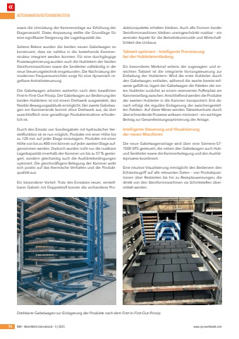 BETONWAREN/BETONWERKSTEIN94 BWI %u2013 BetonWerk International %u2013 5 | 2025 www.cpi-worldwide.comsowie die Umr%u00fcstung der Kammeranlage zur Erh%u00f6hung der Etagenanzahl. Diese Anpassung stellte die Grundlage f%u00fcr eine signifikante Steigerung der Lagerkapazit%u00e4t dar.Seitens Rekers wurden die beiden neuen Gabelwagen so konstruiert, dass sie nahtlos in die bestehende Kammerstruktur integriert werden konnten. F%u00fcr eine durchg%u00e4ngige Prozessoptimierung wurden auch die Hubleitern der beiden Steinformmaschinen sowie die Senkleiter vollst%u00e4ndig in die neue Steuerungstechnik eingebunden. Die Nachr%u00fcstung der modernen Frequenzumrichter sorgt f%u00fcr eine dynamisch regelbare Antriebssteuerung.Die Gabelwagen arbeiten weiterhin nach dem bew%u00e4hrten First-In-First-Out-Prinzip. Der Gabelwagen zur Bedienung der beiden Hubleitern ist mit einem Drehwerk ausgestattet, das flexible Bewegungsabl%u00e4ufe erm%u00f6glicht. Der zweite Gabelwagen am Kammerende kommt ohne Drehwerk aus, da dort ausschlie%u00dflich eine geradlinige Produktentnahme erforderlich ist.Durch den Einsatz von Sondergabeln mit hydraulischer Verstellfunktion ist es nun m%u00f6glich, Produkte mit einer H%u00f6he bis zu 120 mm auf jeder Etage einzulagern. Produkte mit einer H%u00f6he von bis zu 400 mm k%u00f6nnen auf jeder zweiten Etage aufgenommen werden. Dadurch wurden nicht nur die nutzbare Lagerkapazit%u00e4t innerhalb der Kammer um bis zu 57 % gesteigert, sondern gleichzeitig auch die Aush%u00e4rtebedingungen optimiert. Die gleichm%u00e4%u00dfigere Belegung der Kammer wirkt sich positiv auf das thermische Verhalten und die Produktqualit%u00e4t aus.Ein besonderer Vorteil: Trotz des Einsatzes neuer, verstellbarer Gabeln mit Doppelsto%u00df konnte die vorhandene Produktionspalette erhalten bleiben. Auch alle Formen beider Steinformmaschinen bleiben uneingeschr%u00e4nkt nutzbar %u2013 ein zentraler Aspekt f%u00fcr die Betriebskontinuit%u00e4t und Wirtschaftlichkeit des Umbaus.Taktzeit optimiert %u2013 Intelligente Priorisierung bei der HubleiterentladungEin besonderes Merkmal seitens der zugesagten und erreichten Taktzeit ist die integrierte Vorrangsteuerung zur Entladung der Hubleitern: Wird die erste Hubleiter durch den Gabelwagen entladen, w%u00e4hrend die zweite bereits teilweise gef%u00fcllt ist, lagert der Gabelwagen die Paletten der ersten Hubleiter zun%u00e4chst an einem reservierten Pufferplatz am Kammeranfang zwischen. Anschlie%u00dfend werden die Produkte der zweiten Hubleiter in die Kammer transportiert. Erst danach erfolgt die regul%u00e4re Einlagerung der zwischengestellten Paletten. Auf diese Weise werden Taktzeitverluste durch %u00fcberschneidende Prozesse wirksam minimiert %u2013 ein wichtiger Beitrag zur Gesamtleistungsoptimierung der Anlage.Intelligente Steuerung und Visualisierung der neuen MaschinenDie neue Gabelwagenanlage wird %u00fcber eine Siemens-S7-1500-SPS gesteuert, die neben den Gabelwagen auch Hubund Senkleiter sowie die Kammerbelegung und den Aush%u00e4rteprozess koordiniert.Eine intuitive Visualisierung erm%u00f6glicht den Bedienern den Echtzeitzugriff auf alle relevanten Daten %u2013 von Produktpositionen %u00fcber Restzeiten bis hin zu Rezeptzuweisungen, die direkt von den Steinformmaschinen via Schnittstellen %u00fcbermittelt werden.Drehbarer Gabelwagen zur Einlagerung der Produkte nach dem First-In-First-Out-Prinzip