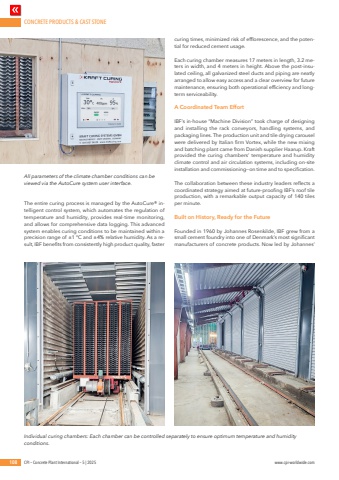 CONCRETE PRODUCTS & CAST STONE108 CPI %u2013 Concrete Plant International %u2013 5 | 2025 www.cpi-worldwide.comThe entire curing process is managed by the AutoCure%u00ae intelligent control system, which automates the regulation of temperature and humidity, provides real-time monitoring, and allows for comprehensive data logging. This advanced system enables curing conditions to be maintained within a precision range of %u00b11 %u00b0C and %u00b14% relative humidity. As a result, IBF benefits from consistently high product quality, faster curing times, minimized risk of efflorescence, and the potential for reduced cement usage.Each curing chamber measures 17 meters in length, 3.2 meters in width, and 4 meters in height. Above the post-insulated ceiling, all galvanized steel ducts and piping are neatly arranged to allow easy access and a clear overview for future maintenance, ensuring both operational efficiency and longterm serviceability.A Coordinated Team EffortIBF%u2019s in-house %u201cMachine Division%u201d took charge of designing and installing the rack conveyors, handling systems, and packaging lines. The production unit and tile drying carousel were delivered by Italian firm Vortex, while the new mixing and batching plant came from Danish supplier Haarup. Kraft provided the curing chambers%u2019 temperature and humidity climate control and air circulation systems, including on-site installation and commissioning%u2014on time and to specification.The collaboration between these industry leaders reflects a coordinated strategy aimed at future-proofing IBF%u2019s roof tile production, with a remarkable output capacity of 140 tiles per minute.Built on History, Ready for the FutureFounded in 1960 by Johannes Rosenkilde, IBF grew from a small cement foundry into one of Denmark%u2019s most significant manufacturers of concrete products. Now led by Johannes%u2019 All parameters of the climate chamber conditions can be viewed via the AutoCure system user interface.Individual curing chambers: Each chamber can be controlled separately to ensure optimum temperature and humidity conditions.