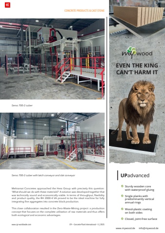 CONCRETE PRODUCTS & CAST STONEwww.cpi-worldwide.com CPI %u2013 Concrete Plant International %u2013 5 | 2025Mehramat Concretes approached the Hess Group with precisely this question: %u2018What should we do with these materials?%u2019 A solution was developed together that was technically sound and economically viable. In terms of throughput, flexibility and product quality, the RH 2000-4 VA proved to be the ideal machine for fully integrating fine aggregates into concrete block production.This close collaboration resulted in the Zero-Waste-Mining project: a production concept that focuses on the complete utilisation of raw materials and thus offers both ecological and economic advantages.Servo 700-2 cuberServo 700-2 cuber with latch conveyor and slat conveyorEVEN THE KING CAN%u2018T HARM ITwww.mywood.de info@mywood.deUPadvancedSturdy wooden core with waterproof gluingSingle planks with predominantly vertical annual ringsWood-plastic coating on both sidesClosed, joint-free surface