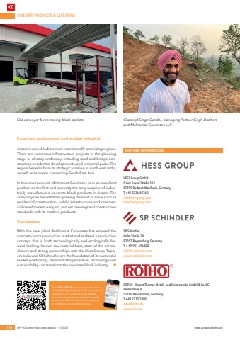 CONCRETE PRODUCTS & CAST STONE114 CPI %u2013 Concrete Plant International %u2013 5 | 2025 www.cpi-worldwide.comEconomic environment and market potentialAssam is one of India's most economically promising regions. There are numerous infrastructure projects in the planning stage or already underway, including road and bridge construction, residential developments, and industrial parks. The region benefits from its strategic location in north-east India, as well as its role in connecting South-East Asia.In this environment, Mehramat Concretes is in an excellent position as the first and currently the only supplier of industrially manufactured concrete block products in Assam. The company can benefit from growing demand in areas such as residential construction, public infrastructure and commercial development early on, and set new regional construction standards with its modern products.ConclusionsWith the new plant, Mehramat Concretes has entered the concrete block production market and realised a production concept that is both technologically and ecologically forward-looking. Its own raw material base, state-of-the-art machinery and strong partnerships with the Hess Group, Topwerk India and SR Schindler are the foundation of its successful market positioning, demonstrating how trust, technology and sustainability can transform the concrete block industry. nFURTHER INFORMATIONHESS Group GmbH Freier-Grund-Stra%u00dfe 123 57299 Burbach-Wahlbach, Germany T +49 2736 49760 info@hessgroup.com www.hessgroup.comSR Schindler Hofer Stra%u00dfe 24 93057 Regensburg, Germany T + 49 941 696820 info@sr-schindler.com www.sr-schindler.comROTHO %u2013 Robert Thomas Metall- und Elektrowerke GmbH & Co. KG Hellerstra%u00dfe 657290 Neunkirchen, Germany T +49 2735 7880 sales@rotho.dewww.rotho.deThe HESS GROUP sponsored the free download possibility of the pdf of this article for all readers of CPI. Please check the website www.cpi-worldwide.com/channels/topwerk or scan the QR code with your smartphone to get direct access to this website.Slat conveyor for removing block packets Charanjit Singh Gandhi, Managing Partner Singh Brothers and Mehramat Concretes LLP.