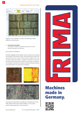 CONCRETE PRODUCTS & CAST STONEwww.cpi-worldwide.com CPI %u2013 Concrete Plant International %u2013 5 | 2025%u2022 Increased automationThe system enables complete production control without operator intervention.Data analysis and feedbackAnother highlight of the system is the continuous recording and analysis of production data. All measurement values are stored and can be used for future batch analyses. The user interface always provides a complete overview of the most recently produced product and the current batch. In addition, the storage of production statistics enables detailed analysis and optimization of production processes.Display on the operator%u2019s monitor for detecting surface defects on the wet side.According to information provided by manufacturers, Frima AQC detects 95% of all surface defects, such as stains, cracks, holes/projections, and inclusions.Machinesmade inGermany.