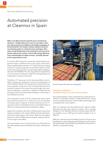 CONCRETE PRODUCTS & CAST STONE120 CPI %u2013 Concrete Plant International %u2013 5 | 2025 www.cpi-worldwide.comWith a new Masa Cuboter, Spanish paver manufacturer Cleannox %u2013 Prefabricados de La Jara S.L. has taken a decisive step towards more efficient and reliable packaging of its end products. The modern solution replaces the previous stacking system to create the paver packages, eliminates central bottlenecks in the production process and impresses with precise motion control, high energy efficiency and a well-thought-out safety concept %u2013 precisely tailored to the requirements on site.In summer 2019, Cleannox extensively modernised its production facility in Villanueva de la Jara, Spain. At that time, Masa supplied a fully automatic L 9.1 block and paver making machine including production board feed, hydraulic desk, multi-colour device and the corresponding safety installation (see also CPi 03/2020). The new ring plant was supplied by a local machine manufacturer, while the existing dosing and mixing plant continues to be used.The Masa L 9.1 has proven to be extremely efficient and reliable in Cleannox's production, much to the satisfaction of owner Alfredo Cebri%u00e1n. His company has experienced continuous growth, mainly due to the increasing demand for its products. However, this success has also brought new operational challenges. In particular, a significant bottleneck was emerging in the area of paver layer stacking, a central step in the production process.The cubing plant used so far for stacking the paver layers had served its purpose for a certain time, but was showing increasing signs of ageing. Its limited capacity and the increasing number of breakdowns led to noticeable losses in efficiency, unplanned downtime and delivery delays.Against this backdrop and after carefully examining various systems available on the market, Alfredo Cebri%u00e1n decided to reorient his technology in this section. Based on his positive experience with the Masa block and paver making machine, he once again chose Masa. The new solution was to not only work more efficiently, but also offer greater process reliability and reduce maintenance costs.Investing in efficiency: The Masa Cuboter as a new cubing solutionThe central element of the comprehensive replacement investment is the Masa Cuboter, a high-performance cubing machine supplemented by modern safety technology and a completely new control system. After the old plant was dismantled by the customer, Masa delivered the fully servo-electric Cuboter. This is already designed in the standard version for product layers with lifting weights of up to 700 kg and product heights of up to 500 mm.With the commissioning of the Masa Cuboter, Cleannox now benefits from a wide range of powerful features and functions that significantly increase efficiency, flexibility and process reliability in automated cubing:Automated precision at Cleannox in SpainMasa GmbH, 56626 Andernach, Germany Put to the test: the previous cubing plant