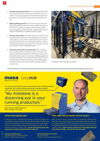CONCRETE PRODUCTS & CAST STONEwww.cpi-worldwide.com CPI %u2013 Concrete Plant International %u2013 5 | 2025 121%u2022 Versatile clamping functions: The clamping basket with main and side clamp is driven by two electric servo cylinders. Clamping programmes and their sequences can be stored in the recipe memory for each specific product.%u2022 Stable grabbing process: The Cuboter grabs the paver layers powerfully so that they remain stable during transfer from the production board to the transport pallet. Interchangeable, product-specific clamping rails ensure optimum adaptation to different product types. %u2022 Precise cube creation: The fully automatic creation of the complete paver cube from the individual paver layers is particularly accurate. This ensures that the paver cube is optimally prepared for the subsequent stations, where it is further processed for transport %u2013 for example, by strapping, foiling or other packaging steps. %u2022 Individual turning device positioning: The turning device is positioned via a tabular input in the recipe. Individual positioning is possible for different products. Additional functions such as centring or offset programmes can also be stored in the recipe in tabular form. The use of toothed belt drives for the lifting and travelling gear enables precise power transmission and high positioning accuracy. Installation of the new Masa CuboterMasa GmbH GreyHUB Andernach Concrete Block, Pavers + Landscaping ProductsMasa-Str. 2 | 56626 Andernach | GermanyMasa GmbH WhiteHUB Porta WestfalicaAAC + Sand-lime BrickOsterkamp 2 | 32457 Porta Westfalica | GermanyAt Masa, we think of nothing but concrete %u2013 and how to shape it for the building materials industry. The machines we design and build are used for the production of concrete blocks, pavers or landscaping products, aerated concrete blocks and (reinforced) panels as well as sand-lime bricks. In other words, we are real concrete heads with a passion for reliable, high-performance machines.Bj%u00f6rn, one of our clever concrete heads, has developed a tool for paver production lines that provides precise information about the quality of the ongoing production. On the wet side, the system measures products, identifi es defects such as cracks, liftings or cement balls and helps you to reduce waste. When it comes to precise 24/7 inline defect detection and resource savings %u2013 just ask the concrete heads.You want to optimise the use of resources but your building material customers only accept minimal tolerances in product quality.%u201cMy milestone is a discerning eye in your running production.%u201dBj%u00f6rn Herborn, R%u2009&%u2009D DepartmentMasa GreyHUB, Andernachwww.masa-group.com NEW Masa Optical Quality Control Systemma-0000805