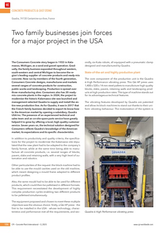CONCRETE PRODUCTS & CAST STONE126 CPI %u2013 Concrete Plant International %u2013 5 | 2025 www.cpi-worldwide.comThe Consumers Concrete story began in 1933 in Kalamazoo, Michigan, as a sand and gravel operation. Gradually, the family business expanded throughout western, south-western and central Michigan to become the region's leading supplier of concrete products and ready-mix concrete. Now run by members of the fourth generation, Consumers Concrete designs, manufactures and markets several ranges of concrete products for construction, public works and landscaping. Production is spread over three manufacturing sites. Consumers also has 20 readymix concrete plants in the region. In 2024, the project to modernise the historic Kalamazoo site was launched and management selected Quadra to supply and install the entire new production line. As for Quadra, it was in 2017 that the French family business decided to export its know-how to the American market by opening a subsidiary, Quadra USA Inc. The presence of an experienced technical and sales team and an on-site spare parts service have greatly helped it to grow by offering a local, high-quality customer service. Seven years on, the technical solution designed for Consumers reflects Quadra's knowledge of the American market, its expectations and its specific characteristics.In addition to productivity and quality criteria, the specifications for the project to modernise the Kalamazoo site stipulated that the new plant had to be adapted to the company's family format, while at the same time being able to manufacture all concrete products, i.e. several ranges of blocks, pavers, slabs and retaining walls, with a very high level of automation and robotics.Other particularities of the request: the block machine had to be able to use the mould cavities used on the old machine, which meant designing a mould frame adapted to different product profiles.Also, the same mould had to be able to be used for different products, which could then be palletised in different formats. This requirement necessitated the development of highly complex production cycles enabling two different products to be palletised simultaneously. The equipment proposed and chosen to meet these multiple objectives was the obvious choice: firstly, a Q6 HP press - the first to be installed in the USA - whose technology, characteristics and performance met all the requirements, and secondly, six Kuka robots, all equipped with a pneumatic clamp designed and manufactured by Quadra.State-of-the-art and highly productive plantThe core component of the production unit is the Quadra 6 High Performance vibrating press. This Q6 HP press uses 1,400 x 520 x 14 mm steel pallets to manufacture high quality blocks, slabs, pavers, retaining walls and landscaping products at high production rates. This type of machine stands out for its advantageous technical features.The vibrating features developed by Quadra are patented and allow its block machines to stand out thanks to their uniform vibrating behaviour. The motorization of the system is Two family businesses join forces for a major project in the USAQuadra, 74130 Contamine-sur-Arve, FranceQuadra 6 High Performance vibrating press