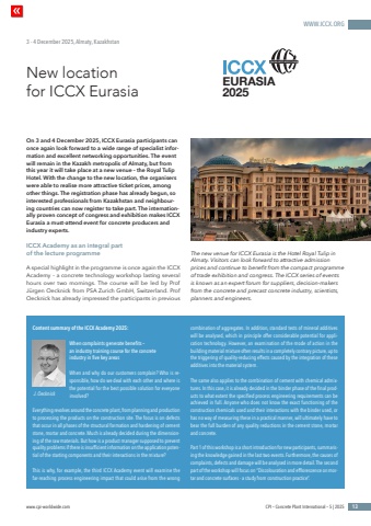 WWW.ICCX.ORGwww.cpi-worldwide.com CPI %u2013 Concrete Plant International %u2013 5 | 2025 13New location for ICCX Eurasia3 - 4 December 2025, Almaty, KazakhstanEURASIA 2025On 3 and 4 December 2025, ICCX Eurasia participants can once again look forward to a wide range of specialist information and excellent networking opportunities. The event will remain in the Kazakh metropolis of Almaty, but from this year it will take place at a new venue %u2013 the Royal Tulip Hotel. With the change to the new location, the organisers were able to realise more attractive ticket prices, among other things. The registration phase has already begun, so interested professionals from Kazakhstan and neighbouring countries can now register to take part. The internationally proven concept of congress and exhibition makes ICCX Eurasia a must-attend event for concrete producers and industry experts.ICCX Academy as an integral part of the lecture programmeA special highlight in the programme is once again the ICCX Academy %u2013 a concrete technology workshop lasting several hours over two mornings. The course will be led by Prof J%u00fcrgen Oecknick from PSA Zurich GmbH, Switzerland. Prof Oecknick has already impressed the participants in previous The new venue for ICCX Eurasia is the Hotel Royal Tulip in Almaty. Visitors can look forward to attractive admission prices and continue to benefit from the compact programme of trade exhibition and congress. The ICCX series of events is known as an expert forum for suppliers, decision-makers from the concrete and precast concrete industry, scientists, planners and engineers.Content summary of the ICCX Academy 2025:When complaints generate benefits %u2013 an industry training course for the concrete industry in five key areasWhen and why do our customers complain? Who is responsible, how do we deal with each other and where is the potential for the best possible solution for everyone involved?Everything revolves around the concrete plant, from planning and production to processing the products on the construction site. The focus is on defects that occur in all phases of the structural formation and hardening of cement stone, mortar and concrete. Much is already decided during the dimensioning of the raw materials. But how is a product manager supposed to prevent quality problems if there is insufficient information on the application potential of the starting components and their interactions in the mixture?This is why, for example, the third ICCX Academy event will examine the far-reaching process engineering impact that could arise from the wrong combination of aggregates. In addition, standard tests of mineral additives will be analysed, which in principle offer considerable potential for application technology. However, an examination of the mode of action in the building material mixture often results in a completely contrary picture, up to the triggering of quality-reducing effects caused by the integration of these additives into the material system.The same also applies to the combination of cement with chemical admixtures. In this case, it is already decided in the binder phase of the final products to what extent the specified process engineering requirements can be achieved in full. Anyone who does not know the exact functioning of the construction chemicals used and their interactions with the binder used, or has no way of measuring these in a practical manner, will ultimately have to bear the full burden of any quality reductions in the cement stone, mortar and concrete.Part 1 of this workshop is a short introduction for new participants, summarising the knowledge gained in the last two events. Furthermore, the causes of complaints, defects and damage will be analysed in more detail. The second part of the workshop will focus on %u201cDiscolouration and efflorescence on mortar and concrete surfaces - a study from construction practice%u201d. J. Oecknick