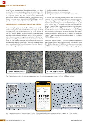 CONCRETE PIPES AND MANHOLES134 CPI %u2013 Concrete Plant International %u2013 5 | 2025 www.cpi-worldwide.comterial%u201d is then separated into the various fractions by a sieve system. The cement paste, ground into powder, leaves the mill with the air and is separated by a filter system. If desired, in a separate second step, the powder can be carbonated with CO2 in batches in a special reactor. The amount of CO2bound in this process, approximately 50-60 kg per ton of powder, is measurable and can therefore be certified.Laboratory tests to determine the concrete conceptAs part of a pilot project with the Federal Association of Concrete Sewer Systems (FBS) and the R%u00f6ser Group, pre-crushed concrete pipes were treated using Sika%u2019s reCO2ver process at the pilot plant in Weiach, Switzerland, to produce new pipes with the recovered materials at the R%u00f6ser II site in Krauchenwies. Since there was no experience with the industrial application of reCO2ver material in semi-dry concrete at that time, the concrete was designed and tested for its production and quality properties in laboratory tests. The following steps were carried out in Sika%u2019s special laboratory for semi-dry concrete technology in Leimen:1 Characterization of the aggregates2. Development of the concrete concept3. Comparison of fresh and hardened concrete dataIn the first step, both the original material and the reCO2ver material were examined for density, water absorption, grading curve, and grain shape. Visual inspection of the reCO2ver material revealed only a few cement-stone residues on the grain surface (Fig. 2). Analysis using the Sika Sand-App revealed a grain shape comparable to the original grain (Fig. 3). The density of the reCO2ver material was slightly lower than that of the original material, which can be explained by the remaining cement-stone residues. The water demand increased only slightly, from 0.7 mass% (concrete suction water 13 l/m%u00b3) to 2.1 mass% (concrete suction water 39 l/m%u00b3) with 100% reCO2ver material.Using the data obtained, a grading curve comparable to the original material was created with the two fractions sand 0/4 (35%) and gravel 4/8 (65%). In the first concrete design, a 100% volumetric replacement of the original aggregates Fig. 2: Visual comparison of the original aggregate with the recycled aggregate treated with the reCO2ver processFig. 3: Comparison of the grain shape of original aggregate and recycled aggregate treated with the reCO2ver process%u00a9 Sika Deutschland CH AG & Co KG %u00a9 Sika Deutschland CH AG & Co KG