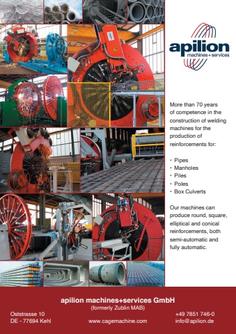 apilion machines+services GmbH (formerly Zublin MAB)www.cagemachine.comMore than 70 years of competence in the con struction of welding machines for the production of reinforcements for:%u2022 Pipes %u2022 Manholes%u2022 Piles%u2022 Poles%u2022 Box CulvertsOur machines can produce round, square, elliptical and conical reinforcements, both semi-automatic and fully automatic.Oststrasse 10DE - 77694 Kehl +49 7851 746-0info@apilion.de