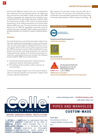 CONCRETE PIPES AND MANHOLESwww.cpi-worldwide.com CPI %u2013 Concrete Plant International %u2013 5 | 2025 137this time with 20% less cement. Here, too, no irregularities were observed. The usual grinding work on the spigot end also produced the usual pattern. Finally, the pipe, with 100% reCO2ver aggregate was subjected to the standard crown compression test by the quality assurance authority. Both the requirements of DIN V 1201 and the increased quality requirements of the Federal Association of Concrete Sewer Systems (FBS) were met. The test production demonstrates that the use of 100% RC aggregates processed using the reCO2ver-process is feasible. Further studies, particularly regarding durability, are needed for regular industrial application.SummaryOur built infrastructure, such as the pipe system made of concrete and reinforced-concrete pipes, is a source of raw materials. The pilot project with the Federal Association of Concrete Sewer Systems (FBS) and the R%u00f6ser Group has shown that 100% recycling of concrete rubble is feasible from a production and concrete technology perspective. An important finding was that the quality of raw material processing is crucial for the sustainability of the new concrete. The reCO2ver process enabled 100% reuse of old concrete: a) The cleaned sand and gravel were of almost primary quality and could be used without problems. b) The resulting cement powder could be used as a cement substitute.Concrete technology insights, such as the precise determination of material properties and volumetric analysis of the concrete, help with optimization.Sika supports the concrete circular economy with the reCO2ver process. The provision of the patented process in combination with specialized application technology leads to the safe implementation of this innovative technology. nFURTHER INFORMATIONSika Deutschland CH AG & Co KGKornwestheimer Str. 103-10770439 Stuttgart, GermanyT +49 711 8009 0 info@de.sika.com, www.sika.dewww.sika.com/en/knowledge-hub/reco2ver-concrete-recycling.htmlBundesfachverband Betonkanalsysteme e.V.www.fbs-beton.de/recyclingR%u00f6ser Vertriebs GmbHwww.roeser-gmbh.de/de/produkte/k-reco2verPIPES AND MANHOLESCUSTOM-MADEwww.collespa.com - info@collespa.com+39 0437 552 121Roberto BadellaSales DirectorColle SpAViale Belluno-Lentiai, 5I-32026 BORGO VALBELLUNA(BL)In 30 years, I have come to understand that theonly truly essential component of our work islistening. If Colle SpA's strength lies in itstailor-made service, it is because we havelearned through experience to thoroughlyunderstand our customers' needs, leading toresults that often exceed their expectations.DESIGN, MANUFACTURING, INSTALLATIONTECHNOLOGIES AND EQUIPEMENTS FOR GREAT PRECAST PRODUCTS IN CONCRETE