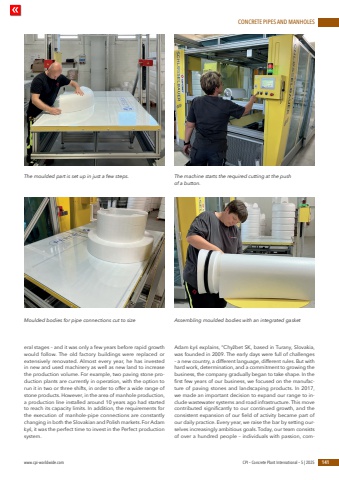 CONCRETE PIPES AND MANHOLESwww.cpi-worldwide.com CPI %u2013 Concrete Plant International %u2013 5 | 2025 141eral stages %u2013 and it was only a few years before rapid growth would follow. The old factory buildings were replaced or extensively renovated. Almost every year, he has invested in new and used machinery as well as new land to increase the production volume. For example, two paving stone production plants are currently in operation, with the option to run it in two or three shifts, in order to offer a wide range of stone products. However, in the area of manhole production, a production line installed around 10 years ago had started to reach its capacity limits. In addition, the requirements for the execution of manhole-pipe connections are constantly changing in both the Slovakian and Polish markets. For Adam %u0141y%u015b, it was the perfect time to invest in the Perfect production system.Adam %u0141y%u015b explains, %u201cChy%u017ebet SK, based in Turany, Slovakia, was founded in 2009. The early days were full of challenges %u2013 a new country, a different language, different rules. But with hard work, determination, and a commitment to growing the business, the company gradually began to take shape. In the first few years of our business, we focused on the manufacture of paving stones and landscaping products. In 2017, we made an important decision to expand our range to include wastewater systems and road infrastructure. This move contributed significantly to our continued growth, and the consistent expansion of our field of activity became part of our daily practice. Every year, we raise the bar by setting ourselves increasingly ambitious goals. Today, our team consists of over a hundred people %u2013 individuals with passion, comThe moulded part is set up in just a few steps.Moulded bodies for pipe connections cut to sizeThe machine starts the required cutting at the push of a button.Assembling moulded bodies with an integrated gasket
