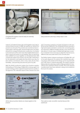 CONCRETE PIPES AND MANHOLES142 CPI %u2013 Concrete Plant International %u2013 5 | 2025 www.cpi-worldwide.commitment, and determination who work together every day to achieve shared success. In 2020, we opened our division for precast concrete parts. The products we manufacture here include system retaining walls, precast bridge parts, and other elements for transport infrastructure construction. It is thanks to the hard work of the entire team that Chy%u017ebet SK has been able to grow and evolve so successfully. Years of searching have enabled us to put together an exceptional team that could be the subject of an article in its own right. I thank them for the dedication and loyalty that they show every day, for their tireless commitment, and in many cases also for their friendship %u2013 because they have become part of my life.%u201dWith the Perfect production system from Austrian supplier Schl%u00fcsselbauer Technology, Chy%u017ebet SK is closing a gap in its product strategy, which is geared toward maximum quality in all segments. The individual nature of the channel runs and pipe connection positions is of great importance in the market served by Chy%u017ebet SK. The complexity of these channels is high by European standards. Junctions for connecting pipes are required at different heights directly in the channel and also above it. In both cases, a reliably leak-tight pipe connection is essential. It has to be easy to adapt the channel runs to different inlet and outlet levels in the concrete plant.The Perfect system supports employees at Chy%u017ebet SK in all of its work sequences. As early as the manhole base planning stage, all the details of the design can be imported with just a few clicks or entered separately. The system supports daily production planning as well as helping workers to manufacture the individual channel moulds. Once the required moulded parts have been selected, cutting can be started at the touch of a button. Complete EPS negative channel ready for assembly in wetcast mouldsDaily production planning is always kept in view All the relevant product details are clearly legible on the productThe made-to-order monolithic manhole bases at the warehouse %u00a9 Chy%u017ebet SK %u00a9 Chy%u017ebet SK