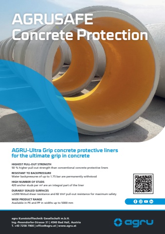 AGRUSAFE Concrete ProtectionAGRU-Ultra Grip concrete protective liners for the ultimate grip in concreteHIGHEST PULL-OUT STRENGTH50 % higher pull-out strength than conventional concrete protective linersRESISTANT TO BACKPRESSUREWater backpressures of up to 1.75 bar are permanently withstoodHIGH NUMBER OF STUDS420 anchor studs per m%u00b2 are an integral part of the linerDURABLY SEALED SURFACES>2200 N/stud shear resistance and 82 t/m%u00b2 pull-out resistance for maximum safetyWIDE PRODUCT RANGEAvailable in PE and PP in widths up to 5000 mmagru Kunststofftechnik Gesellschaft m.b.H. Ing.-Pesendorfer-Strasse 31 | 4540 Bad Hall, AustriaT. +43 7258 7900 | office@agru.at | www.agru.at