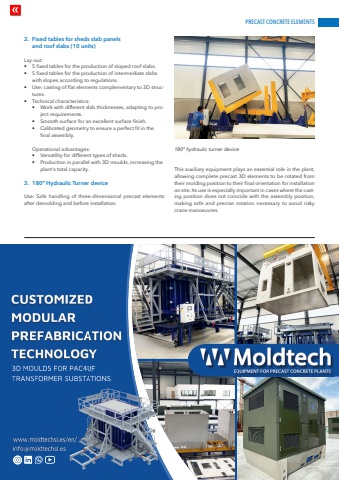 PRECAST CONCRETE ELEMENTSwww.cpi-worldwide.com CPI %u2013 Concrete Plant International %u2013 5 | 2025 1472. Fixed tables for sheds slab panels and roof slabs (10 units)Lay-out:%u2022 5 fixed tables for the production of sloped roof slabs.%u2022 5 fixed tables for the production of intermediate slabs with slopes according to regulations.%u2022 Use: casting of flat elements complementary to 3D structures.%u2022 Technical characteristics:%u2022 Work with different slab thicknesses, adapting to project requirements.%u2022 Smooth surface for an excellent surface finish.%u2022 Calibrated geometry to ensure a perfect fit in the final assembly.Operational advantages:%u2022 Versatility for different types of sheds.%u2022 Production in parallel with 3D moulds, increasing the plant's total capacity. 3. 180%u00ba Hydraulic Turner deviceUse: Safe handling of three-dimensional precast elements after demolding and before installation.This auxiliary equipment plays an essential role in the plant, allowing complete precast 3D elements to be rotated from their molding position to their final orientation for installation on site. Its use is especially important in cases where the casting position does not coincide with the assembly position, making safe and precise rotation necessary to avoid risky crane manoeuvres.180%u00ba hydraulic turner device