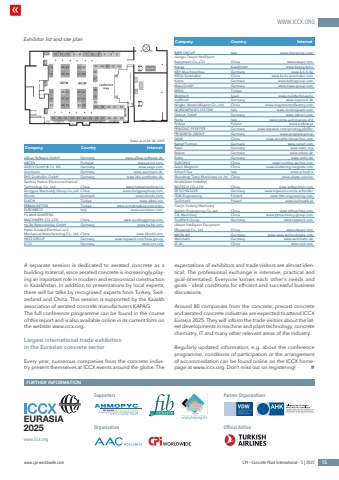 WWW.ICCX.ORGwww.cpi-worldwide.com CPI %u2013 Concrete Plant International %u2013 5 | 2025 15FURTHER INFORMATIONPartner OrganizationsOfficial AirlineEURASIA 2025www.iccx.orgSupportersOrganisationExhibitor list and site planA separate session is dedicated to aerated concrete as a building material, since aerated concrete is increasingly playing an important role in modern and economical construction in Kazakhstan. In addition to presentations by local experts, there will be talks by recognised experts from Turkey, Switzerland and China. This session is supported by the Kazakh association of aerated concrete manufacturers KAPAG.The full conference programme can be found in the course of this report and is also available online in its current form on the website www.iccx.org.Largest international trade exhibition in the Eurasian concrete sectorEvery year, numerous companies from the concrete industry present themselves at ICCX events around the globe. The expectations of exhibitors and trade visitors are almost identical: The professional exchange is intensive, practical and goal-orientated. Everyone knows each other%u2019s needs and goals %u2013 ideal conditions for efficient and successful business discussions.Around 80 companies from the concrete, precast concrete and aerated concrete industries are expected to attend ICCX Eurasia 2025. They will inform the trade visitors about the latest developments in machine and plant technology, concrete chemistry, IT and many other relevant areas of the industry.Regularly updated information, e.g. about the conference programme, conditions of participation or the arrangement of accommodation can be found online on the ICCX homepage at www.iccx.org. Don%u2019t miss out on registering! nAllbau Software GmbH Germany www.allbau-software.deARCEN Portugal www.arcen.comASSYX GmbH & Co. KG Germany www.assyx.comAvermann Germany www.avermann.deBHS Sonthofen GmbH Germany www.bhs-sonthofen.deDezhou Haitian Electromechanical Technology Co., Ltd China www.haitianmachine.cnDongyue Machinery Group Co.,Ltd China www.dongyuegroup.comEhcolo Denmark www.ehcolo.comELKON T%u00fcrkiye www.elkon.netERMAK BETON T%u00fcrkiye www.ermakmakine.com.tr/enEUROMECC Italy www.euromecc.comFUJIAN QUNFENG MACHINERY CO.,LTD China www.qunfenggroup.comHa-Be Betonchemie GmbH Germany www.ha-be.comHebei Xindadi Electrical and Mechanical Manufacturing Co., Ltd. China www.hbxdd.comHESS GROUP Germany www.topwerk.com/hess-groupICCX Germany www.iccx.orgIMER GROUP Italy www.imergroup.comJiangsu Teeyer Intelligent Equipment Co.,LTD China www.teeyer.comKapag Kazakhstan www.kapag.kz/ruKBH Maschinenbau Germany www.k-b-h.deKEDA Suremaker China www.keda-suremaker.comKobra Germany www.kobragroup.comMasa GmbH Germany www.masa-group.comMEKA T%u00fcrkiyeMoldtech Spain www.moldtechsl.es/rumyWood Germany www.mywood.deNingbo Wewin Magnet Co., Ltd. China www.magnetictoolfactory.comNORDIMPIANTI SYSTEM Italy www.nordimpianti.comOsborn GmbH Germany www.osborn.comPenta Italy www.penta-automazioni.it/itPolblat Poland www.polblat.plPRINZING PFEIFFER Germany www.topwerk.com/prinzing-pfeifferPROGRESS GROUP Germany www.progress.groupQGM China www.zenithbrickmachine.comRampf Formen Germany www.rampf.comRatec Germany www.ratec.orgRekers Germany www.rekers.deRotho Germany www.rotho.deRUNDING China www.runding-aacline.comSaixin Magnetic China www.shuttering-magnets.comSchnell Spa Italy www.schnell.itShandong Tianyi Machinery co.,ltd China www.sdyzty.com/enSHANGHAI SHINRAY BIOTECH CO.,LTD China www.sidleychem.comSR SCHINDLER Germany www.topwerk.com/sr-schindlerTDM Engineering Finland www.tdm-engineering.comTechmatik Poland www.techmatik.plTianjin Yinfeng Machinery System Engineering Co.,Ltd China www.tyfmachine.comTJK Machinery China www.tjkmachinery-group.comTopWerk Group Germany www.topwerk.comUkeyer Intelligent Equipment (Zhejiang) Co., Ltd. China www.ukeyer.comWASA AG Germany www.wasa-technologies.comWehrhahn Germany www.wehrhahn.deZCJK China www.zcjk.comCompany Country InternetCompany Country InternetStatus as of 26. 08. 2025