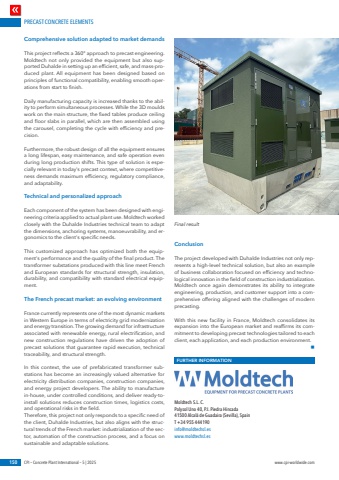 PRECAST CONCRETE ELEMENTS150 CPI %u2013 Concrete Plant International %u2013 5 | 2025 www.cpi-worldwide.comComprehensive solution adapted to market demandsThis project reflects a 360%u00b0 approach to precast engineering. Moldtech not only provided the equipment but also supported Duhalde in setting up an efficient, safe, and mass-produced plant. All equipment has been designed based on principles of functional compatibility, enabling smooth operations from start to finish.Daily manufacturing capacity is increased thanks to the ability to perform simultaneous processes. While the 3D moulds work on the main structure, the fixed tables produce ceiling and floor slabs in parallel, which are then assembled using the carousel, completing the cycle with efficiency and precision.Furthermore, the robust design of all the equipment ensures a long lifespan, easy maintenance, and safe operation even during long production shifts. This type of solution is especially relevant in today's precast context, where competitiveness demands maximum efficiency, regulatory compliance, and adaptability.Technical and personalized approachEach component of the system has been designed with engineering criteria applied to actual plant use. Moldtech worked closely with the Duhalde Industries technical team to adapt the dimensions, anchoring systems, manoeuvrability, and ergonomics to the client's specific needs.This customized approach has optimized both the equipment's performance and the quality of the final product. The transformer substations produced with this line meet French and European standards for structural strength, insulation, durability, and compatibility with standard electrical equipment. The French precast market: an evolving environmentFrance currently represents one of the most dynamic markets in Western Europe in terms of electricity grid modernization and energy transition. The growing demand for infrastructure associated with renewable energy, rural electrification, and new construction regulations have driven the adoption of precast solutions that guarantee rapid execution, technical traceability, and structural strength.In this context, the use of prefabricated transformer substations has become an increasingly valued alternative for electricity distribution companies, construction companies, and energy project developers. The ability to manufacture in-house, under controlled conditions, and deliver ready-toinstall solutions reduces construction times, logistics costs, and operational risks in the field.Therefore, this project not only responds to a specific need of the client, Duhalde Industries, but also aligns with the structural trends of the French market: industrialization of the sector, automation of the construction process, and a focus on sustainable and adaptable solutions. ConclusionThe project developed with Duhalde Industries not only represents a high-level technical solution, but also an example of business collaboration focused on efficiency and technological innovation in the field of construction industrialization. Moldtech once again demonstrates its ability to integrate engineering, production, and customer support into a comprehensive offering aligned with the challenges of modern precasting.With this new facility in France, Moldtech consolidates its expansion into the European market and reaffirms its commitment to developing precast technologies tailored to each client, each application, and each production environment.nFURTHER INFORMATIONMoldtech S.L. C. Polysol Uno 40, P.I. Piedra Hincada 41500 Alcal%u00e1 de Guadaira (Sevilla), Spain T +34 955 444190 info@moldtechsl.es www.moldtechsl.esFinal result