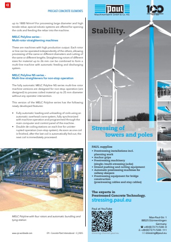 PRECAST CONCRETE ELEMENTSwww.cpi-worldwide.com CPI %u2013 Concrete Plant International %u2013 5 | 2025up to 1800 N/mm%u00b2.For processing large diameter and high tensile rebar, special robotic systems are offered for opening the coils and feeding the rebar into the machine.MELC Polyline series %u2013 Multi-rotor straightening machinesThese are machines with high production output. Each rotor or line can be operated independently of the others, allowing processing of the same or different diameters and cutting of the same or different lengths. Straightening rotors of different sizes for material up to 26 mm can be combined to form a multi-line machine with automatic feeding and discharging system.MELC Polyline NS series %u2013 Multi-line straighteners for non-stop operationThe fully automatic MELC Polyline NS series multi-line rotor machine versions are designed for non-stop operation (are designed) to process coiled material up to 25 mm diameter without any operator intervention.This version of the MELC Polyline series has the following newly developed features:%u2022 Fully automatic loading and unloading of coils using an automatic overhead crane system, fully synchronized with machine operation and programmed through the main computer and control panel of the machine.%u2022 Double de-coiling stations on each line for uninterrupted operation (non-stop system). As soon as one coil is finished, after the last coil is automatically fed out, the next coil is immediately processed.MELC Polyline with four rotors and automatic bundling and tying stationstressing.paul.euMax-Paul-Str. 188525 D%u00fcrmentingenGermany%uf028 +49(0)7371 / 5 00 - 0%uf036 +49(0)7371 / 5 00 - 111%uf02a stressing@paul.euPaul at YouTubestressing-channel.paul.euThe experts in Prestressed Concrete Technology.PAUL supplies%u2022 Prestressing installations incl. planning work%u2022 Anchor grips%u2022 Prestressing machinery(single-/multi-stressing jacks)%u2022 Strand pushing and cutting equipment%u2022 Automatic prestressing machines for railway sleepers%u2022 Prestressing equipment for bridge construction(prestressing cables and stay cables)Stability.Stressing of towers and poles
