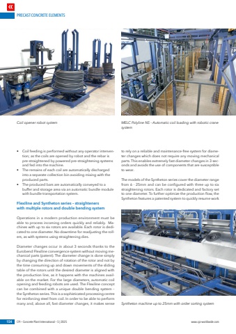 PRECAST CONCRETE ELEMENTS154 CPI %u2013 Concrete Plant International %u2013 5 | 2025 www.cpi-worldwide.com%u2022 Coil feeding is performed without any operator intervention; as the coils are opened by robot and the rebar is pre-straightened by powered pre-straightening systems and fed into the machine.%u2022 The remains of each coil are automatically discharged into a separate collection bin avoiding mixing with the produced parts.%u2022 The produced bars are automatically conveyed to a buffer and storage area via an automatic bundle module with bundle transportation system.Flexiline and Syntheton series %u2013 straighteners with multiple rotors and double bending systemOperations in a modern production environment must be able to process incoming orders quickly and reliably. Machines with up to six rotors are available. Each rotor is dedicated to one diameter. No downtime for readjusting the rollers, as with systems using straightening dies.Diameter changes occur in about 3 seconds thanks to the Eurobend Flexiline convergence system without moving mechanical parts (patent). The diameter change is done simply by changing the direction of rotation of the rotor and not by the time consuming up and down movements of the sliding table of the rotors until the desired diameter is aligned with the production line, as it happens with the machines available on the market. For the large diameters, automatic coil opening and feeding robots are used. The Flexiline concept can be combined with a unique double bending system %u2013 the Syntheton series. This is a sophisticated processing centre for reinforcing steel from coil. In order to be able to perform many and, above all, fast diameter changes, it makes sense to rely on a reliable and maintenance-free system for diameter changes which does not require any moving mechanical parts. This enables extremely fast diameter changes in 3 seconds and avoids the use of components that are susceptible to wear. The models of the Syntheton series cover the diameter range from 6 - 25mm and can be configured with three up to six straightening rotors. Each rotor is dedicated and factory set to one diameter. To further optimize the production flow, the Syntheton features a patented system to quickly resume work Coil opener robot system MELC Polyline NS - Automatic coil loading with robotic crane systemSyntheton machine up to 25mm with order sorting system