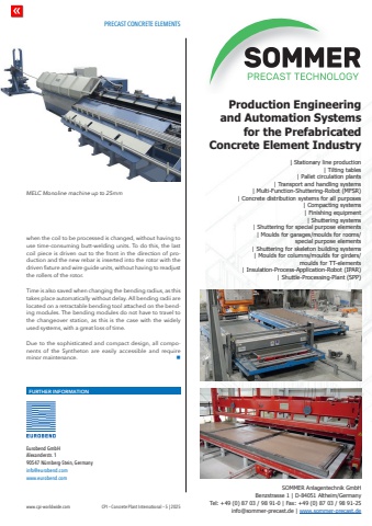 PRECAST CONCRETE ELEMENTSwww.cpi-worldwide.com CPI %u2013 Concrete Plant International %u2013 5 | 2025when the coil to be processed is changed, without having to use time-consuming butt-welding units. To do this, the last coil piece is driven out to the front in the direction of production and the new rebar is inserted into the rotor with the driven fixture and wire guide units, without having to readjust the rollers of the rotor.Time is also saved when changing the bending radius, as this takes place automatically without delay. All bending radii are located on a retractable bending tool attached on the bending modules. The bending modules do not have to travel to the changeover station, as this is the case with the widely used systems, with a great loss of time.Due to the sophisticated and compact design, all components of the Syntheton are easily accessible and require minor maintenance. nFURTHER INFORMATIONEurobend GmbHAlexanderstr. 190547 N%u00fcrnberg-Stein, Germanyinfo@eurobend.comwww.eurobend.comMELC Monoline machine up to 25mmSOMMER Anlagentechnik GmbHBenzstrasse 1 | D-84051 Altheim/GermanyTel: +49 (0) 87 03 / 98 91-0 | Fax: +49 (0) 87 03 / 98 91-25info@sommer-precast.de | www.sommer-precast.de| Stationary line production| Tilting tables| Pallet circulation plants| Transport and handling systems| Multi-Function-Shuttering-Robot (MFSR)| Concrete distribution systems for all purposes| Compacting systems| Finishing equipment| Shuttering systems| Shuttering for special purpose elements| Moulds for garages/moulds for rooms/special purpose elements| Shuttering for skeleton building systems| Moulds for columns/moulds for girders/moulds for TT-elements| Insulation-Process-Application-Robot (IPAR)| Shuttle-Processing-Plant (SPP)Production Engineering and Automation Systems for the Prefabricated Concrete Element Industry