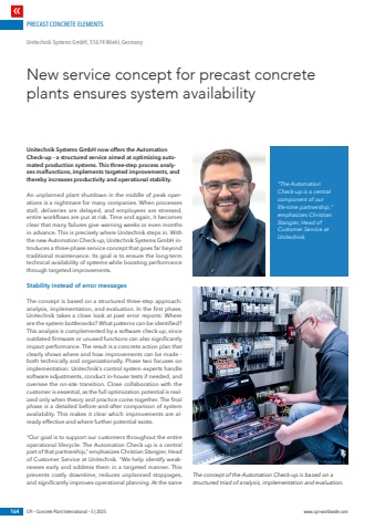 PRECAST CONCRETE ELEMENTS164 CPI %u2013 Concrete Plant International %u2013 5 | 2025 www.cpi-worldwide.comUnitechnik Systems GmbH now offers the Automation Check-up - a structured service aimed at optimizing automated production systems. This three-step process analyses malfunctions, implements targeted improvements, and thereby increases productivity and operational stability.An unplanned plant shutdown in the middle of peak operations is a nightmare for many companies. When processes stall, deliveries are delayed, and employees are stressed, entire workflows are put at risk. Time and again, it becomes clear that many failures give warning weeks or even months in advance. This is precisely where Unitechnik steps in. With the new Automation Check-up, Unitechnik Systems GmbH introduces a three-phase service concept that goes far beyond traditional maintenance. Its goal is to ensure the long-term technical availability of systems while boosting performance through targeted improvements.Stability instead of error messagesThe concept is based on a structured three-step approach: analysis, implementation, and evaluation. In the first phase, Unitechnik takes a close look at past error reports: Where are the system bottlenecks? What patterns can be identified? This analysis is complemented by a software check-up, since outdated firmware or unused functions can also significantly impact performance. The result is a concrete action plan that clearly shows where and how improvements can be made - both technically and organizationally. Phase two focuses on implementation: Unitechnik%u2019s control system experts handle software adjustments, conduct in-house tests if needed, and oversee the on-site transition. Close collaboration with the customer is essential, as the full optimization potential is realized only when theory and practice come together. The final phase is a detailed before-and-after comparison of system availability. This makes it clear which improvements are already effective and where further potential exists.%u201cOur goal is to support our customers throughout the entire operational lifecycle. The Automation Check-up is a central part of that partnership,%u201d emphasizes Christian Stangier, Head of Customer Service at Unitechnik. %u201cWe help identify weaknesses early and address them in a targeted manner. This prevents costly downtime, reduces unplanned stoppages, and significantly improves operational planning. At the same New service concept for precast concrete plants ensures system availabilityUnitechnik Systems GmbH, 51674 Wiehl, Germany\ Automation Check-up is a central component of our life-time partnership,\emphasizes Christian Stangier, Head of Customer Service at Unitechnik.The concept of the Automation Check-up is based on a structured triad of analysis, implementation and evaluation.