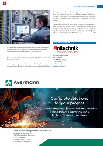 PRECAST CONCRETE ELEMENTSwww.cpi-worldwide.com CPI %u2013 Concrete Plant International %u2013 5 | 2025 165time, on-site teams are relieved, allowing them to focus on their core tasks.%u201dA striking example of the Automation Check-up%u2019s success was demonstrated during its first deployment at a logistics facility: through the analysis and subsequent measures, the downtime of a stacker crane due to malfunctions was reduced by 94 hours per month. This enabled the customer to efficiently store and retrieve an additional 4,215 handling units per month.The service is aimed at companies that want to future-proof their existing automation. The concept%u2019s effectiveness is already evident in practice: many customers have opted for regular execution of Automation Check-ups - a strong indication of the lasting value of this service. nFURTHER INFORMATIONUnitechnik Systems GmbH Fritz-Kotz-Str. 14 51674 Wiehl, Germany T +49 2261 9870 info@unitechnik.comwww.unitechnik.comA precise before-and-after comparison of system availability makes it possible to see which improvements are already taking effect and where there is further potential.Complete solutions for your projectCirculation plant | Formwork and moulds Tilting tables | Vibration lines Pallets | Special machinesAvermann Betonfertigteiltechnik GmbH & Co. KGLengericher Landstr. 35 49078 Osnabr%u00fcck %u25a0 GermanyT + 49 5405 505-0 E info@avermann.de I www.avermann.de