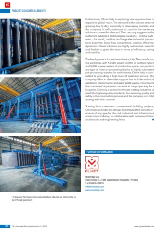 PRECAST CONCRETE ELEMENTS172 CPI %u2013 Concrete Plant International %u2013 5 | 2025 www.cpi-worldwide.comFurthermore, Olmet Italy is exploring new opportunities to expand its global reach. The demand in the precast sector is growing day by day, especially in developing markets, and the company is well positioned to provide the necessary solutions to meet this demand. The company suggests to the customers advanced technological solutions %u2013 entirely automatic %u2013 for small, medium and large-size industrial productions. Expertise, know-how, competence, passion, efficiency, dynamism. Olmet solutions are highly customized, versatile and flexible to grant the best in terms of efficiency, saving and usability.The headquarter is located near Venice, Italy. The manufacturing workshop, with 43,000 square meters of outdoor space and 8,000 square meters of production space, can perform any type of material processing thanks to highly automated pre-processing systems for steel sheets. Olmet Italy is committed to providing a high-level of customer service. The company offers an after-sales support that includes technical assistance, maintenance and spare parts supply. This ensures that customers' equipment can work in the proper way for a long time. Olmet is a partner for the pre-casting industries to reach the highest quality standards, thus ensuring quality and safety in the construction process and the company is in total synergy with the customer.Starting from customers' conventional building projects, Olmet also provides the design of prefabricated concrete elements of any type for the civil, industrial and infrastructure construction industry, in collaboration with renowned Italian architecture and engineering firms. nFURTHER INFORMATIONOlmet Italy s.r.l.vicolo Treviso, 1, 31040 Signoressa di Trevignano (TV), ItalyT +39 0423 670225info@olmetitaly.comwww.olmetitaly.comHydraulic formwork to manufacture staircase elements in overhead position