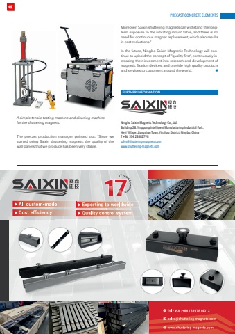 PRECAST CONCRETE ELEMENTSwww.cpi-worldwide.com CPI %u2013 Concrete Plant International %u2013 5 | 2025 175The precast production manager pointed out: %u201cSince we started using Saixin shuttering magnets, the quality of the wall panels that we produce has been very stable. Moreover, Saixin shuttering magnets can withstand the longterm exposure to the vibrating mould table, and there is no need for continuous magnet replacement, which also results in cost reductions.%u201d In the future, Ningbo Saixin Magnetic Technology will continue to uphold the concept of %u201cquality first%u201d, continuously increasing their investment into research and development of magnetic fixation devices, and provide high quality products and services to customers around the world. nA simple tensile testing machine and cleaning machine for the shuttering magnets. FURTHER INFORMATIONNingbo Saixin Magnetic Technology Co., Ltd. Building 28, Yinggong Intelligent Manufacturing Industrial Park, Heyi Village, Jiangshan Town, Yinzhou District, Ningbo, ChinaT +86 574 28802798 sales@shuttering-magnets.com www.shuttering-magnets.com