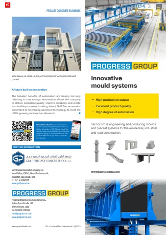 PRECAST CONCRETE ELEMENTSwww.cpi-worldwide.com CPI %u2013 Concrete Plant International %u2013 5 | 2025A future built on innovationThe broader benefits of automation are hereby not only referring to cost savings. Automation allows the company to deliver consistent quality, improve reliability, and create sustainable processes. Looking ahead, Gulf Precast remains committed to leveraging advanced technology to meet the UAE%u2019s growing construction demands. nVilla Nova La Rosa, a project completed with precast wall panels.FURTHER INFORMATIONGulf Precast Concrete Company LLCHead Office, ICAD-1, Musaffah Industrial,Musaffah, Abu Dhabi, UAET +971 2 5502044www.gulfprecast.aeProgress Maschinen & Automation AG Julius-Durst-Stra%u00dfe 10039042 Brixen, ItalyT+39 0472 979100 info@progress-m.com www.progress-m.comPROGRESS GROUP sponsored the free download possibility of the pdf of this article for all readers of CPI. Please check the website www.cpi-worldwide.com/channels/progress-group or scan the QR code with your smartphone to get direct access to this website.Innovative mould systems%u02db High production output%u02db Excellent product quality%u02db High degree of automationwww.tecnocom.comTecnocom is engineering and producing moulds and precast systems for the residential, industrial and road construction.