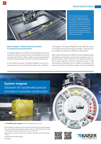 PRECAST CONCRETE ELEMENTSwww.cpi-worldwide.com CPI %u2013 Concrete Plant International %u2013 5 | 2025 183System Magnet %u2013 efficient fastening solution for precast concrete productionThe System Magnets are ideal for all embedded components required for factory-prepared electrical installations in precast concrete wall and floor slabs. In both manual and automated manufacturing processes, they ensure precise positioning.In automated processes, the System Magnets can be accurately placed on the steel formwork table using a multifunctional gripper. The System Magnet Plus also offers the option of automatic removal and magazine storage %u2013 ensuring maximum efficiency and process reliability in production.With a high holding force of 500 N, the System Magnet keeps embedded components securely and precisely in their intended position. Side notches on the magnet bodies enable accurate alignment of device connection boxes %u2013 both horizontally and vertically, even in multiple combinations. The precise fit between the system magnet and the embedded The formwork robot places the System Magnets exactly according to the CAD drawing specifications, following which the electrical installation boxes are attached to the magnets. A robotic arm with a gripper picks up the System Magnets from a magazine and positions them on the formwork table.KAI0925CPISystem magnet. Solutions for automated precastconcrete in concrete construction.The KAISER system magnet. Well-connected from the start.%u2022 The complete installation can be carried out with only one type of magnet%u2022 For automated setting (system magnet, item no. 1299-69) and/or setting and removal (system magnet Plus, item no. 1299-70)%u2022 Four sideway notches ensure torsion-proof installation of the one-gang boxes%u2022 Adhesive force 500 N (50 kg)%u2022 Reusable