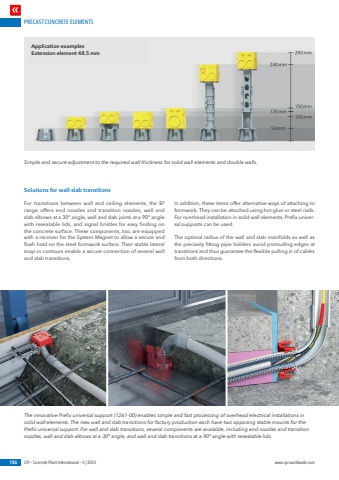 PRECAST CONCRETE ELEMENTS186 CPI %u2013 Concrete Plant International %u2013 5 | 2025 www.cpi-worldwide.comSolutions for wall-slab transitionsFor transitions between wall and ceiling elements, the B%u00b2 range offers end nozzles and transition nozzles, wall and slab elbows at a 30%u00b0 angle, wall and slab joints at a 90%u00b0 angle with resealable lids, and signal bristles for easy finding on the concrete surface. These components, too, are equipped with a receiver for the System Magnet to allow a secure and flush hold on the steel formwork surface. Their stable lateral snap-in contours enable a secure connection of several wall and slab transitions.In addition, these items offer alternative ways of attaching to formwork. They can be attached using hot glue or steel nails. For overhead installation in solid wall elements, Prefix universal supports can be used.The optimal radius of the wall and slab manifolds as well as the precisely fitting pipe holders avoid protruding edges at transitions and thus guarantee the flexible pulling in of cables from both directions.Simple and secure adjustment to the required wall thickness for solid wall elements and double walls. The innovative Prefix universal support (1261-00) enables simple and fast processing of overhead electrical installations in solid wall elements. The new wall and slab transitions for factory production each have two opposing stable mounts for the Prefix universal support. For wall and slab transitions, several components are available, including end nozzles and transition nozzles, wall and slab elbows at a 30%u00b0 angle, and wall and slab transitions at a 90%u00b0 angle with resealable lids. Application examplesExtension element 48.5 mm