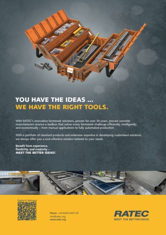 Phone +49 6205 9407-29info@ratec.orgwww.ratec.orgProduct CatalogueWith RATEC%u2019s innovative formwork solutions, proven for over 30 years, precast concrete manufacturers receive a toolbox that solves every formwork challenge effi ciently, intelligently, and economically %u2013 from manual applications to fully automated production.With a portfolio of standard products and extensive expertise in developing customised solutions, we always offer you a cost-effective solution tailored to your needs.Benefi t from experience,fl exibility, and creativity %u2013MEET THE BETTER IDEAS!YOU HAVE THE IDEAS ...WE HAVE THE RIGHT TOOLS.