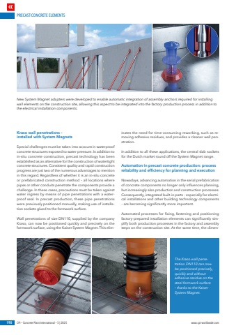 PRECAST CONCRETE ELEMENTS190 CPI %u2013 Concrete Plant International %u2013 5 | 2025 www.cpi-worldwide.comKraso wall penetrations %u2013 installed with System MagnetsSpecial challenges must be taken into account in waterproof concrete structures exposed to water pressure. In addition to in-situ concrete construction, precast technology has been established as an alternative for the construction of watertight concrete structures. Consistent quality and rapid construction progress are just two of the numerous advantages to mention in this regard. Regardless of whether it is an in-situ concrete or prefabricated construction method %u2013 all locations where pipes or other conduits penetrate the components provide a challenge. In these cases, precautions must be taken against water ingress by means of pipe penetrations with a waterproof seal. In precast production, these pipe penetrations were previously positioned manually, making use of installation sockets glued to the formwork surface.Wall penetrations of size DN110, supplied by the company Kraso, can now be positioned quickly and precisely on the formwork surface, using the Kaiser System Magnet. This eliminates the need for time-consuming reworking, such as removing adhesive residues, and provides a cleaner wall penetration.In addition to all these applications, the central slab sockets for the Dutch market round off the System Magnet range.Automation in precast concrete production: process reliability and efficiency for planning and executionNowadays, advancing automation in the serial prefabrication of concrete components no longer only influences planning, but increasingly also production and construction processes. Consequently, integrated built-in parts %u2013 especially for electrical installations and other building technology components %u2013 are becoming significantly more important.Automated processes for fixing, fastening and positioning factory-prepared installation elements can significantly simplify both production processes in the factory and assembly steps on the construction site. At the same time, the dimenNew System Magnet adapters were developed to enable automatic integration of assembly anchors required for installing wall elements on the construction site, allowing this aspect to be integrated into the factory production process in addition to the electrical installation components.The Kraso wall penetration DN110 can now be positioned precisely, quickly and without adhesive residue on the steel formwork surface %u2013 thanks to the Kaiser System Magnet.