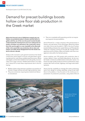 PRECAST CONCRETE ELEMENTS198 CPI %u2013 Concrete Plant International %u2013 5 | 2025 www.cpi-worldwide.comBefore the financial crisis of 2008 there existed only one hollow core production plant in Greece and this factor together with the use of the more favoured inverted double T-slabs limited the development and more widespread utilization of hollow core elements in the construction sector. Even this was brought to a near standstill as the aftermath of the crisis caused this one production site to close and hollow core slabs all but disappeared from the Greek market for almost a decade.Slowly as the economic cycle gained momentum the Greek construction sector began to recover and generated a growing demand for multi-storey prefabricated structures, offices and logistic centres that needed to be built quickly, economically and in large volumes. Prefabricated hollow core slabs are a natural fit to meet these requirements due to the following:%u2022 Modern plants using extrusion machines can produce elements in large volumes and with high production rates%u2022 They are economical, requiring less material and labour to manufacture%u2022 They are completely self-supporting and do not require any supports during installation.Armos Precast S.A., a major company in the precast sector in Greece, was well aware of the advantages offered by hollow core slabs. Armos was founded in 1985 in the city of Larissa, located halfway between the capital Athens and Thessaloniki. Today the company is led by its founder Mr. George Orologopoulos and his children, Nikos and Vasiliki, both have management roles within the family business.Armos employs over 270 people with production sites in Larissa, Athens, Crete, and North Macedonia. As the market leader in Greece%u2019s prefabricated construction sector, it is known for high-quality products and has contributed to major projects like metro tunnels, highways, and large-scale developments.Armos has the capability to manage the entire production cycle, from design to turnkey assembly, using its own staff. Since its foundation, it has focused on the continuous improvement of production processes, using state-of-the-art Demand for precast buildings boosts hollow core floor slab production in the Greek marketNordimpianti System Srl, 66100 Chieti (CH), ItalyAerial view of Armos production site in Larissa