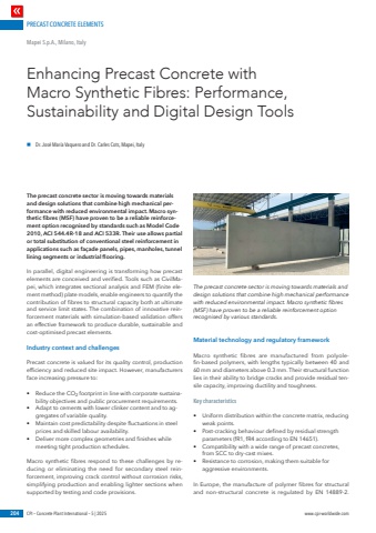 PRECAST CONCRETE ELEMENTS204 CPI %u2013 Concrete Plant International %u2013 5 | 2025 www.cpi-worldwide.comThe precast concrete sector is moving towards materials and design solutions that combine high mechanical performance with reduced environmental impact. Macro synthetic fibres (MSF) have proven to be a reliable reinforcement option recognised by standards such as Model Code 2010, ACI 544.4R-18 and ACI 533R. Their use allows partial or total substitution of conventional steel reinforcement in applications such as fa%u00e7ade panels, pipes, manholes, tunnel lining segments or industrial flooring.In parallel, digital engineering is transforming how precast elements are conceived and verified. Tools such as CivilMapei, which integrates sectional analysis and FEM (finite element method) plate models, enable engineers to quantify the contribution of fibres to structural capacity both at ultimate and service limit states. The combination of innovative reinforcement materials with simulation-based validation offers an effective framework to produce durable, sustainable and cost-optimised precast elements.Industry context and challengesPrecast concrete is valued for its quality control, production efficiency and reduced site impact. However, manufacturers face increasing pressure to:%u2022 Reduce the CO2 footprint in line with corporate sustainability objectives and public procurement requirements.%u2022 Adapt to cements with lower clinker content and to aggregates of variable quality.%u2022 Maintain cost predictability despite fluctuations in steel prices and skilled labour availability.%u2022 Deliver more complex geometries and finishes while meeting tight production schedules.Macro synthetic fibres respond to these challenges by reducing or eliminating the need for secondary steel reinforcement, improving crack control without corrosion risks, simplifying production and enabling lighter sections when supported by testing and code provisions.Material technology and regulatory frameworkMacro synthetic fibres are manufactured from polyolefin-based polymers, with lengths typically between 40 and 60 mm and diameters above 0.3 mm. Their structural function lies in their ability to bridge cracks and provide residual tensile capacity, improving ductility and toughness.Key characteristics%u2022 Uniform distribution within the concrete matrix, reducing weak points.%u2022 Post-cracking behaviour defined by residual strength parameters (fR1, fR4 according to EN 14651).%u2022 Compatibility with a wide range of precast concretes, from SCC to dry-cast mixes.%u2022 Resistance to corrosion, making them suitable for aggressive environments.In Europe, the manufacture of polymer fibres for structural and non-structural concrete is regulated by EN 14889-2. Enhancing Precast Concrete with Macro Synthetic Fibres: Performance, Sustainability and Digital Design ToolsMapei S.p.A., Milano, Italyn Dr. Jos%u00e9 Mar%u00eda Vaquero and Dr. Carles Cots, Mapei, ItalyThe precast concrete sector is moving towards materials and design solutions that combine high mechanical performance with reduced environmental impact. Macro synthetic fibres (MSF) have proven to be a reliable reinforcement option recognised by various standards.
