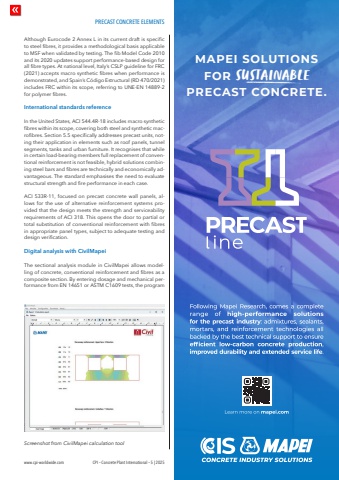 PRECAST CONCRETE ELEMENTSwww.cpi-worldwide.com CPI %u2013 Concrete Plant International %u2013 5 | 2025Although Eurocode 2 Annex L in its current draft is specific to steel fibres, it provides a methodological basis applicable to MSF when validated by testing. The fib Model Code 2010 and its 2020 updates support performance-based design for all fibre types. At national level, Italy%u2019s CSLP guideline for FRC (2021) accepts macro synthetic fibres when performance is demonstrated, and Spain%u2019s C%u00f3digo Estructural (RD 470/2021) includes FRC within its scope, referring to UNE-EN 14889-2 for polymer fibres.International standards referenceIn the United States, ACI 544.4R-18 includes macro synthetic fibres within its scope, covering both steel and synthetic macrofibres. Section 5.5 specifically addresses precast units, noting their application in elements such as roof panels, tunnel segments, tanks and urban furniture. It recognises that while in certain load-bearing members full replacement of conventional reinforcement is not feasible, hybrid solutions combining steel bars and fibres are technically and economically advantageous. The standard emphasises the need to evaluate structural strength and fire performance in each case.ACI 533R-11, focused on precast concrete wall panels, allows for the use of alternative reinforcement systems provided that the design meets the strength and serviceability requirements of ACI 318. This opens the door to partial or total substitution of conventional reinforcement with fibres in appropriate panel types, subject to adequate testing and design verification.Digital analysis with CivilMapeiThe sectional analysis module in CivilMapei allows modelling of concrete, conventional reinforcement and fibres as a composite section. By entering dosage and mechanical performance from EN 14651 or ASTM C1609 tests, the program Screenshot from CivilMapei calculation toolMAPEI SOLUTIONSFOR SUSTAINABLEPRECAST CONCRETE.
