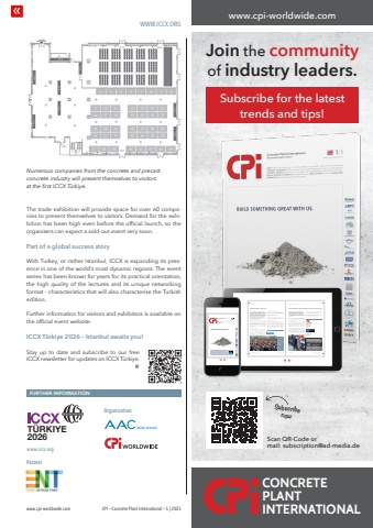 WWW.ICCX.ORGwww.cpi-worldwide.com CPI %u2013 Concrete Plant International %u2013 5 | 2025FURTHER INFORMATIONwww.iccx.orgT%u00dcRKIYE2026PartnerOrganisationThe trade exhibition will provide space for over 60 companies to present themselves to visitors. Demand for the exhibition has been high even before the official launch, so the organisers can expect a sold-out event very soon.Part of a global success storyWith Turkey, or rather Istanbul, ICCX is expanding its presence in one of the world%u2019s most dynamic regions. The event series has been known for years for its practical orientation, the high quality of the lectures and its unique networking format - characteristics that will also characterise the Turkish edition.Further information for visitors and exhibitors is available on the official event website.ICCX T%u00fcrkiye 2026 %u2013 Istanbul awaits you!Stay up to date and subscribe to our free ICCX newsletter for updates on ICCX T%u00fcrkiye.nNumerous companies from the concrete and precast concrete industry will present themselves to visitors at the first ICCX T%u00fcrkiye.www.cpi-worldwide.comNEWS NEWS16 CPI %u2013 Concrete Plant International %u2013 6 | 2024 www.cpi-worldwide.com www.cpi-worldwide.com CPI %u2013 Concrete Plant International %u2013 6 | 2024 17The mbk group is growing and integrating the Italian pile cage welding machine manufacturer Difer Impianti. Founded in 2007 by Leo Ferrari, the company specializes in the development and manufacture of its own piling machines. The machines on offer cover the entire range of sizes up to 3 m in diameter, including an extensive portfolio of accessories.Difer Impianti and mbk are united by a very similar corporate philosophy of offering customers a high-quality, reliable and durable product. Combined with strong customer orientation and focus on after-sales service.%u201cAfter decades of dedication to the design and marketing of piling machines that have improved the production of foundation piles around the world, the time has come for me to retire. It is with great pleasure that I have sold my company Difer Impianti to Mario Pfender of mbk, safe in the knowledge that he will be able to continue it with great success,%u201d says Leo Ferrari.Mario Pfender, Managing Partner at mbk comments: %u201cI am looking forward to the new challenge and the opportunities we have together. The Difer gas shielded arc welding machines complement mbk's resistance welding machines perfectly. Together we are able to cover almost all requirements in the field of cage welding machines for bored pile cages. With the gas-shielded arc welding machines, the resistance welding machines and the patented Dual Weld Option (which combines both technologies in one machine), we offer a range that no other supplier can match.%u201dBoth companies benefit from their respective experience in this segment and want to utilize synergies in the future, not only in the areas of sales and service. nDifer Impianti becomes part of the mbk groupmbk Maschinenbau GmbH, 88353 Ki%u00dflegg, GermanyFURTHER INFORMATIONmbk Maschinenbau GmbH Friedrich-List-Str. 19 88353 Ki%u00dflegg, Germany T +49 7563 91310 info@mbk-kisslegg.dewww.mbk-kisslegg.deDifer ImpiantiVia dell'Artigianato, 12 64010 Martinsicuro TE, ItalyT +39 0861 762187 info@diferimpianti.comwww.diferimpianti.comMario Pfender (l) and Leo FerrariProfessional translations for the concrete and precast industriesGerman %u2022 English %u2022 French Spanish %u2022 Italianhjk multilingual communication partnersEnsener Weg 16 Phone: +49-2203-5358151149 Cologne www.hjk-mlcp.comGermany mail@hjk-mlcp.combauma is the world's leading industry event for construction machinery, building material machines, machinery for the mining industry, construction vehicles and construction equipment and, with a total exhibition area of 614,000 square metres, is the largest trade fair in the world in terms of exhibition space. bauma has a three-year cycle; the next edition will take place from 7 to 13 April 2025 in Munich. More than 3000 exhibitors from about 60 countries and about 500,000 international visitors are expected. The key themes of bauma 2025Digitization and sustainability %u2013 these are the future guiding principles of our industry. They are reflected in the five key themes of bauma 2025, which were defined together with the bauma partner, the VDMA %u2013 Construction Machinery and Building Material Plant Association, as well as representatives of the industry. These key themes will be brought to life in the bauma supporting programme and through the innovations of the exhibitors. bauma Innovation AwardThe bauma Innovation Award is presented in five categories. The prize will be awarded for the fourteenth time and is non-material, i.e. it is not associated with prize money.The competition is a joint project under the leadership of the VDMA Construction Equipment and Building Material Plants, Messe M%u00fcnchen, the Main Association of the German Construction Industry (HDB), the Central Association of the German Construction Industry (ZDB) and the Federal Association of Building Materials %u2013 Rocks and Associated Materials (bbs).Halls B and C with a focus on plant engineering for the concrete industryHalls B and C have been the centre of the concrete industry for years. Here, plant manufacturers from this industry can be found presenting their innovations to the public. Innovation Hall bauma LAB0In a manner of speaking, Hall B0 is the melting pot of industry, science and the start-up scene. In 2025, the five key themes of bauma will once again be presented in the bauma LAB0 Innovation Hall and examined from different perspectives. Keynotes, panel discussions, exhibitor contributions and one-on-one discussions offer a 360%u00ba view of currently relevant topics in the construction machinery and mining industry and underpin bauma's position as an important hub for knowledge transfer. nbauma 2025 in MunichDon't miss it!FURTHER INFORMAT