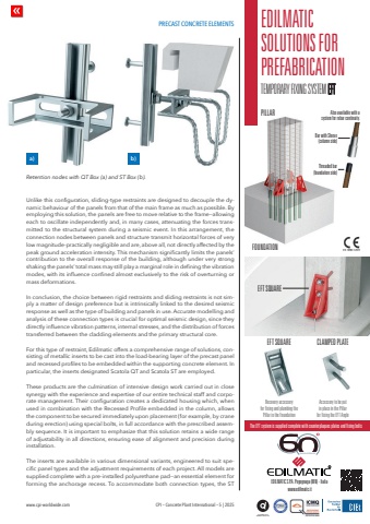 PRECAST CONCRETE ELEMENTSwww.cpi-worldwide.com CPI %u2013 Concrete Plant International %u2013 5 | 2025Unlike this configuration, sliding-type restraints are designed to decouple the dynamic behaviour of the panels from that of the main frame as much as possible. By employing this solution, the panels are free to move relative to the frame%u2014allowing each to oscillate independently and, in many cases, attenuating the forces transmitted to the structural system during a seismic event. In this arrangement, the connection nodes between panels and structure transmit horizontal forces of very low magnitude-practically negligible and are, above all, not directly affected by the peak ground acceleration intensity. This mechanism significantly limits the panels%u2019 contribution to the overall response of the building, although under very strong shaking the panels%u2019 total mass may still play a marginal role in defining the vibration modes, with its influence confined almost exclusively to the risk of overturning or mass deformations.In conclusion, the choice between rigid restraints and sliding restraints is not simply a matter of design preference but is intrinsically linked to the desired seismic response as well as the type of building and panels in use. Accurate modelling and analysis of these connection types is crucial for optimal seismic design, since they directly influence vibration patterns, internal stresses, and the distribution of forces transferred between the cladding elements and the primary structural core.For this type of restraint, Edilmatic offers a comprehensive range of solutions, consisting of metallic inserts to be cast into the load-bearing layer of the precast panel and recessed profiles to be embedded within the supporting concrete element. In particular, the inserts designated Scatola QT and Scatola ST are employed.These products are the culmination of intensive design work carried out in close synergy with the experience and expertise of our entire technical staff and corporate management. Their configuration creates a dedicated housing which, when used in combination with the Recessed Profile embedded in the column, allows the component to be secured immediately upon placement (for example, by crane during erection) using special bolts, in full accordance with the prescribed assembly sequence. It is important to emphasize that this solution retains a wide range of adjustability in all directions, ensuring ease of alignment and precision during installation.The inserts are available in various dimensional variants, engineered to suit specific panel types and the adjustment requirements of each project. All models are supplied complete with a pre-installed polyurethane pad%u2014an essential element for forming the anchorage recess. To accommodate both connection types, the ST Retention nodes with QT Box (a) and ST Box (b).a) b)Recovery accessory for fixing and plumbing the Pillar in the FoundationAccessory to be put in place in the Pillar for fixing the EFT AngleEFT SQUAREEFT SQUAREThe EFT system is supplied complete with counterplaques plates and fixing boltsCLAMPED PLATEPILLAR Also available with a system for rebar continuity.Bar with Sleeve (column side)FOUNDATIONe e)Threaded bar (foundation side)EDILMATIC SOLUTIONS FOR PREFABRICATIONTEMPORARY FIXING SYSTEM EFTACCREDITATOINSERTI QUALITA%u2019REDILMATIC S.P.A. Pegognaga (MN) - Italia www.edilmatic.itANNIVERSARY