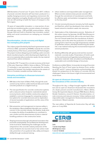 FAIRS & EVENTS216 CPI %u2013 Concrete Plant International %u2013 5 | 2025 www.cpi-worldwide.com200 kilometres of tunnel over 15 years. Since 2017, millions of precast concrete elements will have been produced in a rapidly changing economic and regulatory environment. Between adaptation and agility, Stradal and Cerib have worked and are still working to build the future of transport in the Paris region.10 years of responsible innovation: a cross-section of projects that are transforming the concrete industry. A retrospective with two voices - CSR and QSE communication - led by Groupe H2d and Cerib to illustrate how innovation, sustainability and social commitment are reshaping our industrial practices.Decarbonisation, circular economy and digital: two exemplary pilot projectsThe Juliper project (funded by the French government as part of France 2030, operated by ADEME), towards the concrete industry factory of the future, presented by Alfi Technologies. The project involves designing and installing a pilot concrete block manufacturing line, while developing its digital twin. Its aim is to massively reduce production waste, the raw material used and thus carbon emissions.The Studios TSF 77 project for a circular economy at the heart of film sets. Opening in 2024 in Seine-et-Marne, TSF Studios 77 embodies a new generation of sustainable film studios. Covering 52 hectares, this backlot reproduces the streets of Paris in a modular, reusable and low-carbon way.Interactive workshops to showcase tomorrow%u2018s trends and innovations%u2022 BIM data at the heart of B%u00e9ton Pr%u00e9fa, through the work carried out by Cerib to collect technical data and model concrete products on a digital mock-up.%u2022 The new specification for concrete construction systems with a reduced carbon footprint: materials & material economy levers, which enables construction players to establish a common language for comparing constructive systems for concrete structures and an exploration of several examples of applications and the value of the functional unit.%u2022 Risk prevention and management to improve safety in the workplace. Musculoskeletal disorders are a central concern in the concrete industry; the Exattrac study aims to analyse the ability of exoskeletons to contribute to user comfort and the attractiveness of jobs in material handling positions in the construction sector.%u2022 Shaping tomorrow through educational innovation that promotes employability and professional development at the local level. Addressing the challenges and developments in the concrete industry (reduction of the carbon footprint, bio-sourced, local or low-carbon materials, prevention of occupational risks, safety and responsibility) through vocational training.%u2022 Urban resilience and responsible water management: What concrete solutions does precast concrete offer, through the commitment of manufacturers and Cerib, for effective water and sanitation management, based on five key areas?%u2022 Circular economy & resource recovery, by Cerib experts and NeoCem, which has developed a low-carbon claybased cement to transform waste into resources.%u2022 Optimisation of the clinkerisation process - Reduction of the carbon impact, by Syensqo, the IMT Nord Europe engineering school and Cerib, with on the one hand a fluorine-rich mineral waste from the manufacture of electric batteries, and on the other the production of a clinker requiring fuel to reach the very high temperatures needed to synthesise cement, ultimately transforming this waste into a raw material reducing the environmental impact of cement production.%u2022 Building differently with geosourced and bio-sourced materials: concrete studies. Presentation of Cerib%u2018s work on the mechanical and hygrothermal performance of alternative materials: tests, simulations and feedback for sustainable and controlled design of structures.Conference entitled %u2018B%u00e9ton: la travers%u00e9e du temps (Concrete: Standing the Test of Time)%u2019 given by Antoine Picon, professor of 20th and 21st century architecture and technology, who shared his perspective on the history of concrete and the challenges it faces in the future in light of environmental and social issues. An open-air showroom showcasing the innovations of the concrete industryThroughout the day, a village brought together 40 exhibitors and an open-air showroom showcased the innovations of a dozen precast concrete manufacturers: Alkern, Befree, Carsey 3D, Capremib, Edycem, Groupe PBM, Muance, Rector, Stradal, Sotubema, around 4 themes: Decarbonisation, circular economy and resource recovery / Urban resilience and responsible water management / Environmental and societal commitment / Mixed materials.The next edition of Expertise & Construction Day will take place on 2 July 2026. nFURTHER INFORMATIONCerib1 rue des Longs R%u00e9ages28230 %u00c9pernon, FranceT +33 2 37 18 48 00www.cerib.com, www.expertiseetconstruction.com