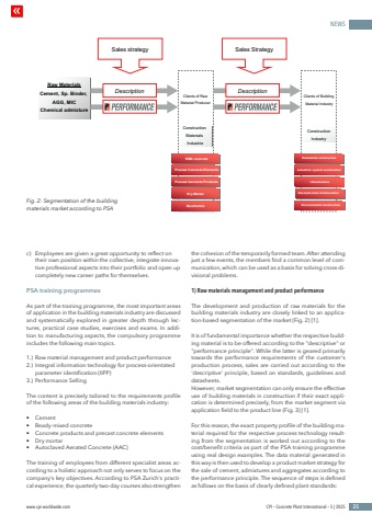 NEWSwww.cpi-worldwide.com CPI %u2013 Concrete Plant International %u2013 5 | 2025 25%u0017ff2%u0001%u0013ff/\\%u0008%u000e%u000e%u0005%u0001%u0013%u0010%\%u000c%u0016%u0011ffi ffifflflffl%u0011%u0013!%u000c&%)*(+ffi*!&%%u0001%u0013%u001a*ff(!%u001a#)%u0001%u0011%ffl+)*(!ff%u0003%u000f%u000e%u000b%u0010%u0014%u0013%u0001%u0011%u000c%u0001%u0007%u0008%u0016%u0001%u0005%u0008%u0014%u000b%u0012%u000e%u0008%u000f%u0001%u0006%u0012%u0011%u0015%u0009%u000b%u0012%u0001%u0003%u000b%u0016%u0009%u0015%u000e%u0014%u0017%u000e%u0013%u0012%u000c&%)*(+ffi*!&%%u0011%ffl+)*(.%u0003%u000b%u0016%u0009%u0015%u000e%u0014%u0017%u000e%u0013%u0012%u0003%u000f%u000e%u000b%u0010%u0014%u0013%u0001%u0011%u000c%u0001%u0015%u000e%u000f%u000e%u0010%u0005%u0008%u0014%u000b%u0012%u000e%u0008%u000f%u0001%u0004%u0010%u0015%u0013%u0014%u0012%u0017%u000c%u0016%u0011ffi%u0001%u000cfflflffl%u0011%u0013!%u0008%u0006%u0009%u0001%u000b%u0013%u0012%u000b%u0014%u0016%u0007%u0014%u000b%u0015%u0016%u0001%u0003%u0013%u0012%u000b%u0014%u0016%u0001%u0005%u0010%u0011%u0012%u0016%u0015%u0007%u0014%u000b%u0015%u0016%u0001%u0003%u0013%u0012%u000b%u0014%u0016%u0001%u0007%u0014%u0013%u000c%u0017%u000b%u0016%u0015%u0006%u0013%u000c%u0009%u000f%u0014%u000c%u0007%u0001%u0008%u0010%u000f%u0013%u0014%u0012%u0015%u0008%u0014%u000c%u0010%u000f%u0005%u000f%u0009%u0015%u0013%u0014%u0012%u000c%u0007%u0003 %u0013%u0011%u0008%u000c%u0007%u0001%u0008%u0010%u000f%u0013%u0014%u0012%u0015%u0008%u0014%u000c%u0010%u000f%u0005%u000f%u000b%u0012%u0007%u0013%u0014%u0012%u0015%u0008%u0014%u0015%u0012%u0001%u0004%u0014%u0018%u0001%u0006%u0013%u0014%u0016%u0014 %u0006%u0008%u0010%u000f%u0013%u0014%u0012%u0015%u0008%u0014%u000c%u0010%u000f%u0001%u0001%u0006%u000f%u0010%u0016%u0007%u0014%u000c%u0010%u000f,%u0017%u000b%u000e%u0011%u000f %u0004%u000f%u0016%u000c%u0012%u0010%u000f%u000e%u000f%u0014%u0007%u0001%u0008%u0010%u000f%u0013%u0014%u0012%u0015%u0008%u0014%u000c%u0010%u000fc) Employees are given a great opportunity to reflect on their own position within the collective, integrate innovative professional aspects into their portfolio and open up completely new career paths for themselves. PSA training programmes As part of the training programme, the most important areas of application in the building materials industry are discussed and systematically explored in greater depth through lectures, practical case studies, exercises and exams. In addition to manufacturing aspects, the compulsory programme includes the following main topics.1.) Raw material management and product performance2.) Integral information technology for process-orientated parameter identification (IIPP)3.) Performance SellingThe content is precisely tailored to the requirements profile of the following areas of the building materials industry:%u2022 Cement%u2022 Ready-mixed concrete%u2022 Concrete products and precast concrete elements%u2022 Dry mortar%u2022 Autoclaved Aerated Concrete (AAC)The training of employees from different specialist areas according to a holistic approach not only serves to focus on the company's key objectives. According to PSA Zurich's practical experience, the quarterly two-day courses also strengthen the cohesion of the temporarily formed team. After attending just a few events, the members find a common level of communication, which can be used as a basis for solving cross-divisional problems. 1) Raw materials management and product performanceThe development and production of raw materials for the building materials industry are closely linked to an application-based segmentation of the market (Fig. 2) [1].It is of fundamental importance whether the respective building material is to be offered according to the \\ principle\towards the performance requirements of the customer's production process, sales are carried out according to the 'descriptive' principle, based on standards, guidelines and datasheets.However, market segmentation can only ensure the effective use of building materials in construction if their exact application is determined precisely, from the market segment via application field to the product line (Fig. 3) [1]. For this reason, the exact property profile of the building material required for the respective process technology resulting from the segmentation is worked out according to the cost/benefit criteria as part of the PSA training programme using real design examples. The data material generated in this way is then used to develop a product market strategy for the sale of cement, admixtures and aggregates according to the performance principle. The sequence of steps is defined as follows on the basis of clearly defined plant standards: Fig. 2: Segmentation of the building materials market according to PSA