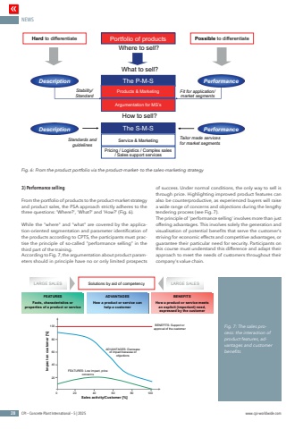 NEWS28 CPI %u2013 Concrete Plant International %u2013 5 | 2025 www.cpi-worldwide.com3) Performance sellingFrom the portfolio of products to the product-market strategy and product sales, the PSA approach strictly adheres to the three questions: 'Where?', 'What?' and 'How?' (Fig. 6).While the \tion-oriented segmentation and parameter identification of the products according to CPTS, the participants must practise the principle of so-called \third part of the training.According to Fig. 7, the argumentation about product parameters should in principle have no or only limited prospects of success. Under normal conditions, the only way to sell is through price. Highlighting improved product features can also be counterproductive, as experienced buyers will raise a wide range of concerns and objections during the lengthy tendering process (see Fig. 7).The principle of 'performance selling' involves more than just offering advantages. This involves solely the generation and visualisation of potential benefits that serve the customer's striving for economic effects and competitive advantages, or guarantee their particular need for security. Participants on this course must understand this difference and adapt their approach to meet the needs of customers throughout their company's value chain.Fig. 6: From the product portfolio via the product-market- to the sales-marketing strategyFig. 7: The sales process: the interaction of product features, advantages and customer benefits%u0007%u0013%u0015%u0017%u000f%u0013%u0012%u0011%u0013%u0001%u0013%u000f%u0001%u0014%u0015%u0013%u0018%u000c%u0017%u0016%u0009%u0010%u000e%u0001%u0007%u0003%u0006%u0003%u0008%u0009%u0010%u000e%u0001%u0008%u0003%u0006%u0003%u0008%u000f%u0018&fl ffl%u001a%u0001%u0011%u0016%u0013%u0013%u0012fl%u0012%u0019ffl%u0016%u000fffl%u0012 %u0012