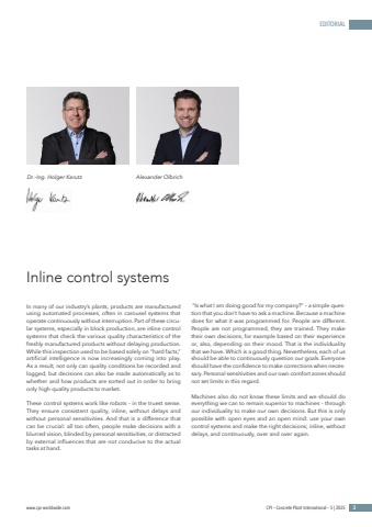 www.cpi-worldwide.com CPI %u2013 Concrete Plant International %u2013 5 | 2025 3EDITORIALDr.-Ing. Holger Karutz Alexander OlbrichIn many of our industry%u2019s plants, products are manufactured using automated processes, often in carousel systems that operate continuously without interruption. Part of these circular systems, especially in block production, are inline control systems that check the various quality characteristics of the freshly manufactured products without delaying production. While this inspection used to be based solely on %u201chard facts,%u201d artificial intelligence is now increasingly coming into play. As a result, not only can quality conditions be recorded and logged, but decisions can also be made automatically as to whether and how products are sorted out in order to bring only high-quality products to market.These control systems work like robots %u2013 in the truest sense. They ensure consistent quality, inline, without delays and without personal sensitivities. And that is a difference that can be crucial: all too often, people make decisions with a blurred vision, blinded by personal sensitivities, or distracted by external influences that are not conducive to the actual tasks at hand. %u201cIs what I am doing good for my company?%u201d %u2013 a simple question that you don%u2019t have to ask a machine. Because a machine does for what it was programmed for. People are different. People are not programmed, they are trained. They make their own decisions, for example based on their experience or, also, depending on their mood. That is the individuality that we have. Which is a good thing. Nevertheless, each of us should be able to continuously question our goals. Everyone should have the confidence to make corrections when necessary. Personal sensitivities and our own comfort zones should not set limits in this regard. Machines also do not know these limits and we should do everything we can to remain superior to machines %u2013 through our individuality to make our own decisions. But this is only possible with open eyes and an open mind: use your own control systems and make the right decisions; inline, without delays, and continuously, over and over again. Inline control systems