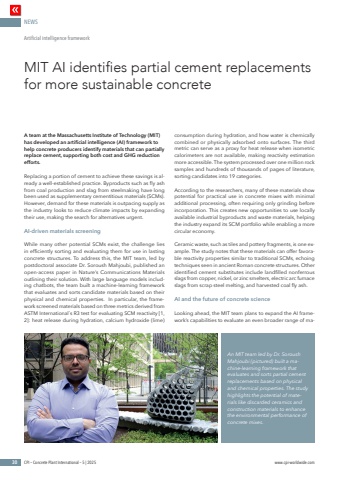 NEWS30 CPI %u2013 Concrete Plant International %u2013 5 | 2025 www.cpi-worldwide.comA team at the Massachusetts Institute of Technology (MIT) has developed an artificial intelligence (AI) framework to help concrete producers identify materials that can partially replace cement, supporting both cost and GHG reduction efforts.Replacing a portion of cement to achieve these savings is already a well-established practice. Byproducts such as fly ash from coal production and slag from steelmaking have long been used as supplementary cementitious materials (SCMs). However, demand for these materials is outpacing supply as the industry looks to reduce climate impacts by expanding their use, making the search for alternatives urgent.AI-driven materials screeningWhile many other potential SCMs exist, the challenge lies in efficiently sorting and evaluating them for use in lasting concrete structures. To address this, the MIT team, led by postdoctoral associate Dr. Soroush Mahjoubi, published an open-access paper in Nature%u2019s Communications Materials outlining their solution. With large language models including chatbots, the team built a machine-learning framework that evaluates and sorts candidate materials based on their physical and chemical properties. In particular, the framework screened materials based on three metrics derived from ASTM International%u00b4s R3 test for evaluating SCM reactivity [1, 2]: heat release during hydration, calcium hydroxide (lime) consumption during hydration, and how water is chemically combined or physically adsorbed onto surfaces. The third metric can serve as a proxy for heat release when isometric calorimeters are not available, making reactivity estimation more accessible. The system processed over one million rock samples and hundreds of thousands of pages of literature, sorting candidates into 19 categories.According to the researchers, many of these materials show potential for practical use in concrete mixes with minimal additional processing, often requiring only grinding before incorporation. This creates new opportunities to use locally available industrial byproducts and waste materials, helping the industry expand its SCM portfolio while enabling a more circular economy. Ceramic waste, such as tiles and pottery fragments, is one example. The study notes that these materials can offer favorable reactivity properties similar to traditional SCMs, echoing techniques seen in ancient Roman concrete structures. Other identified cement substitutes include landfilled nonferrous slags from copper, nickel, or zinc smelters, electric arc furnace slags from scrap steel melting, and harvested coal fly ash.AI and the future of concrete scienceLooking ahead, the MIT team plans to expand the AI framework%u2019s capabilities to evaluate an even broader range of maMIT AI identifies partial cement replacements for more sustainable concreteArtificial intelligence frameworkAn MIT team led by Dr. Soroush Mahjoubi (pictured) built a machine-learning framework that evaluates and sorts partial cement replacements based on physical and chemical properties. The study highlights the potential of materials like discarded ceramics and construction materials to enhance the environmental performance of concrete mixes.